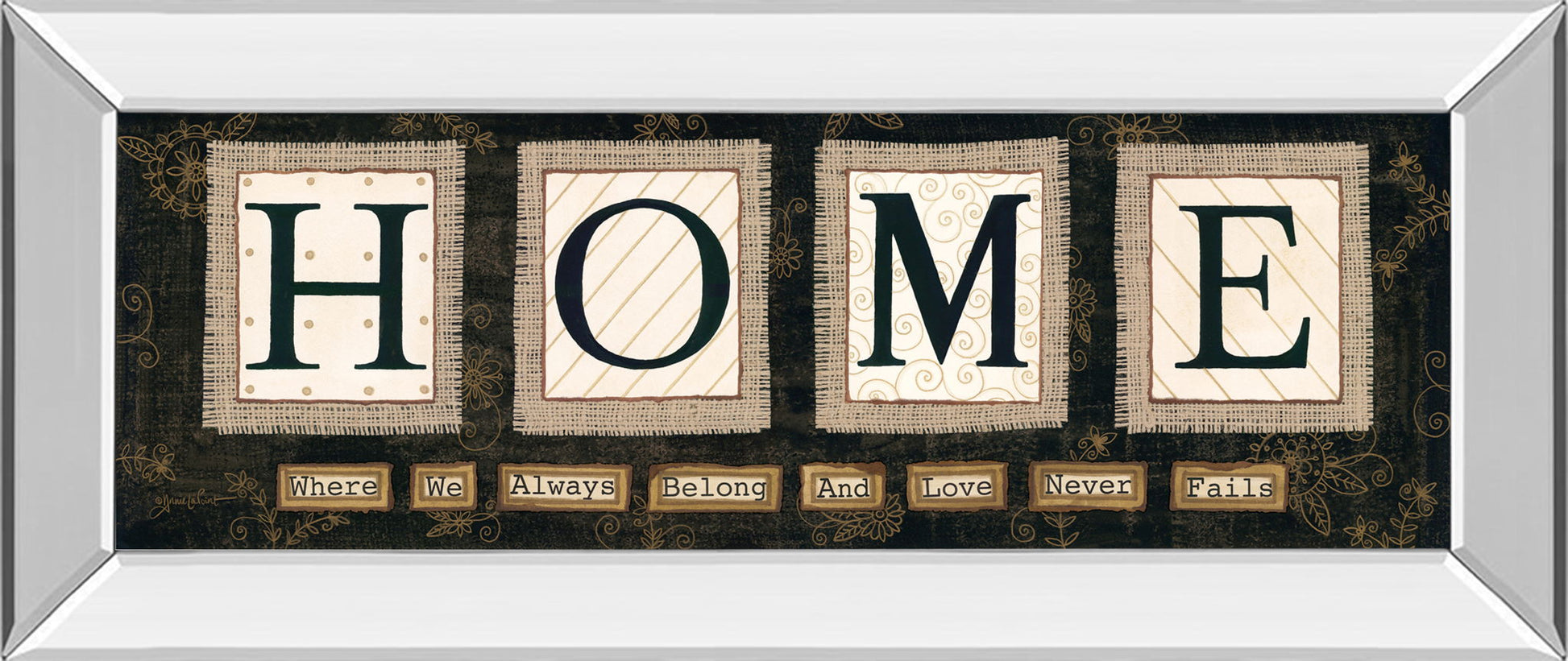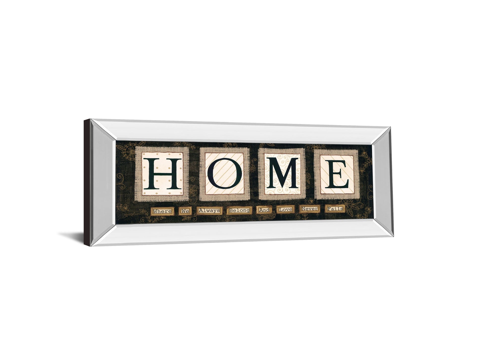Embrace the heartfelt message of belonging with this captivating "Home" wall art. Each letter is showcased in bold, elegant typography framed by textured patterns and subtle floral scrollwork, evoking warmth and comfort. The sleek mirrored frame adds a contemporary shine, reflecting light and enhancing the artwork’s depth, while the rich palette of black, beige, brown, cream, and white complements a variety of decor styles. Protected by premium real glass, the intricate details and vibrant colors remain vivid and clear. Perfectly sized for living rooms, entryways, or offices, this piece invites a sense of peace and love into any space, making it a cherished reminder that home is where love never fails.
