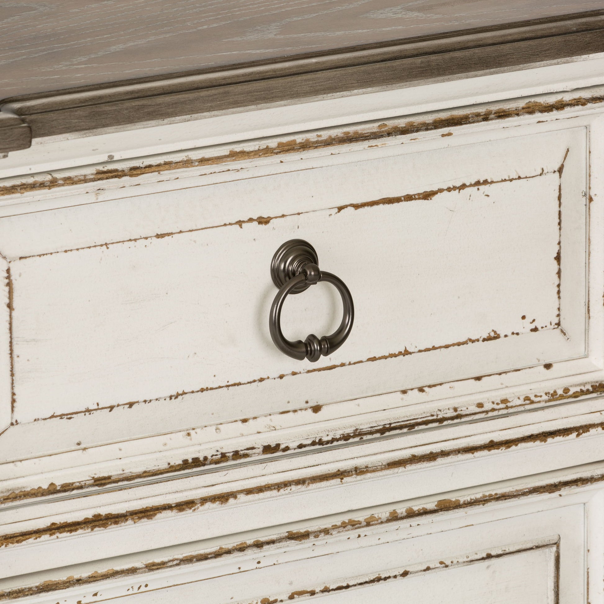 Blending of European traditional design influences makes Abbey Park a truly unique style for any living space. Warm antique finishes and artistic distressing along with grand scale makes Abbey Park a group to be passed to generations. The antique white finish with heavy chipping combines with the weathered brown white wash tops for a truly unique look. Bail and drop ring hardware in antique pewter add the finishing touch to the cases.