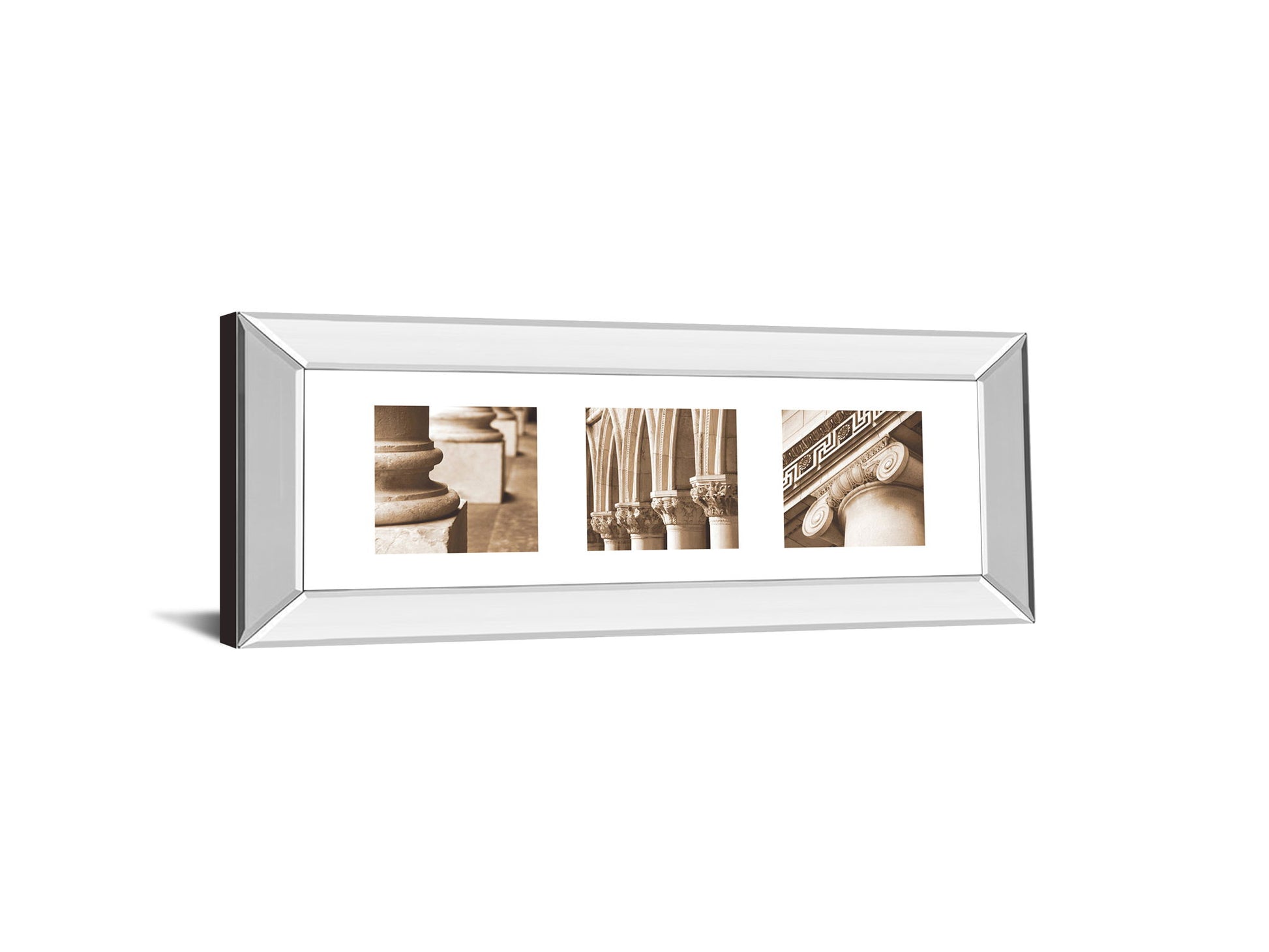 Step into a world where classical architecture meets modern elegance with this captivating triptych. The three sepia-toned photographic panels showcase intricate columns and arches, evoking a timeless sense of grandeur and craftsmanship. Encased in a sleek mirrored frame, the artwork reflects light beautifully, adding depth and sophistication to any living room, office, or hallway. Each panel is protected by premium real glass, preserving the fine details and textures of the stonework with crystal clarity. Expertly crafted and ready to hang, this framed wall art blends historic beauty with contemporary style to elevate your space effortlessly.