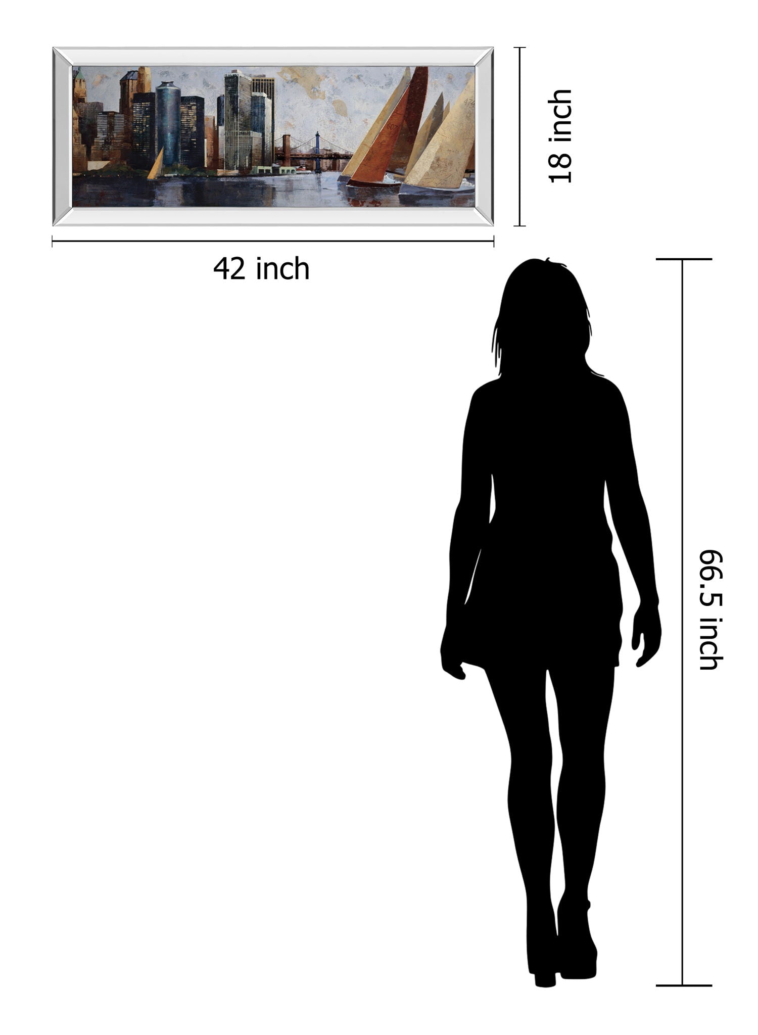 Step into the vibrant energy of a bustling harbor with this captivating piece that celebrates the iconic Manhattan skyline. The artwork beautifully captures sailboats gliding across reflective waters, framed by towering city buildings and a distant bridge, evoking a sense of urban adventure and tranquility. Encased in a sleek silver mirrored frame, this piece enhances any living room or office with its blend of contemporary style and timeless city charm, crafted with real glass for clarity and durability, ready to transform your space into a sophisticated urban retreat.
