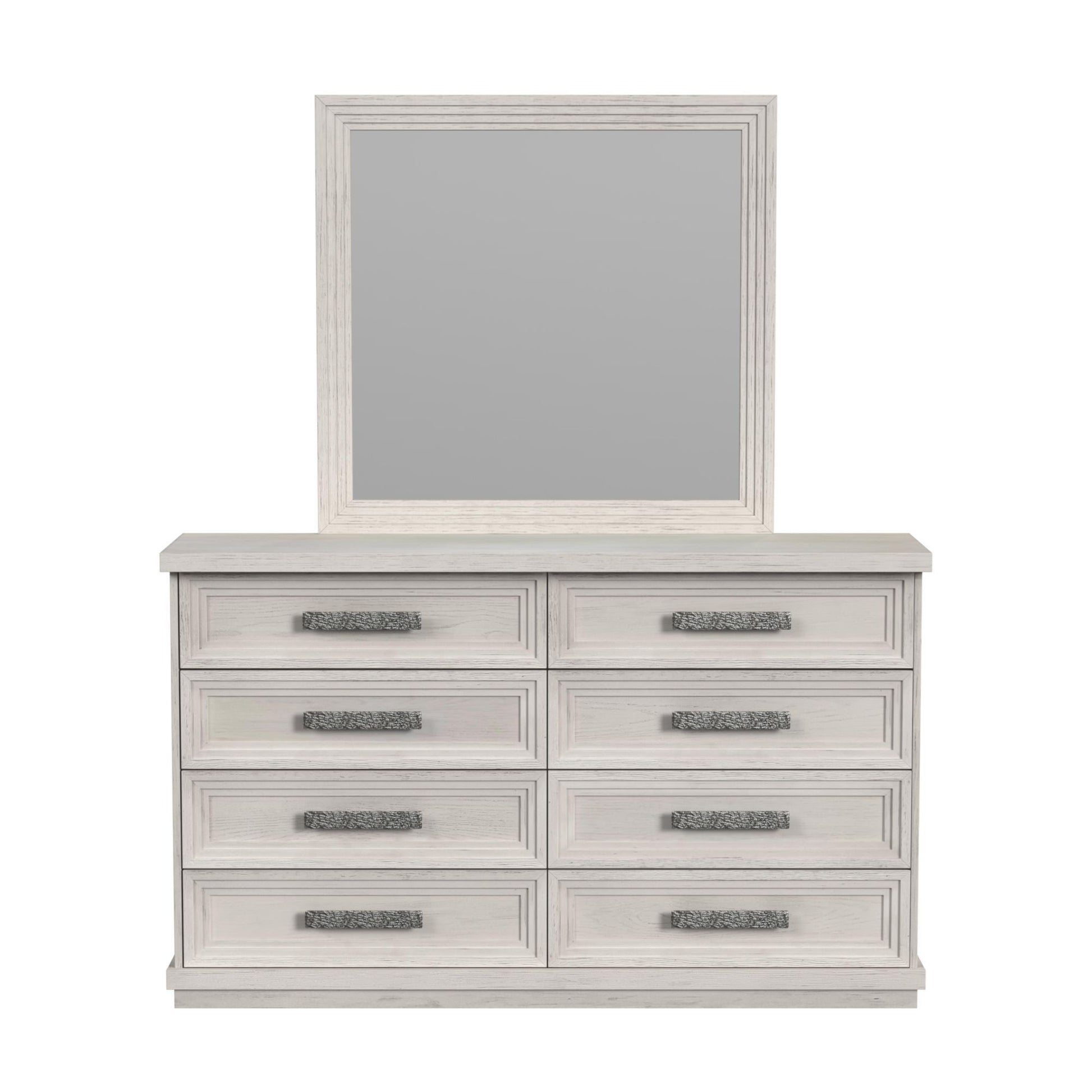 The Avalanche Dresser and Mirror Set enhances your bedroom with the versatile appeal of transitional style. Its antique white finish radiates warmth and charm, creating an inviting atmosphere that complements any décor. The drawer fronts feature an elegantly paneled design that adds depth and visual interest, while the distinctive metal pulls with nail-hammered texture provide a striking contrast. With eight spacious drawers, the dresser offers ample storage for clothing and bedroom essentials. The elegantly framed mirror completes the set with a coordinated, refined look. Choose the Avalanche Dresser and Mirror Set for a stylish and practical addition to your home.