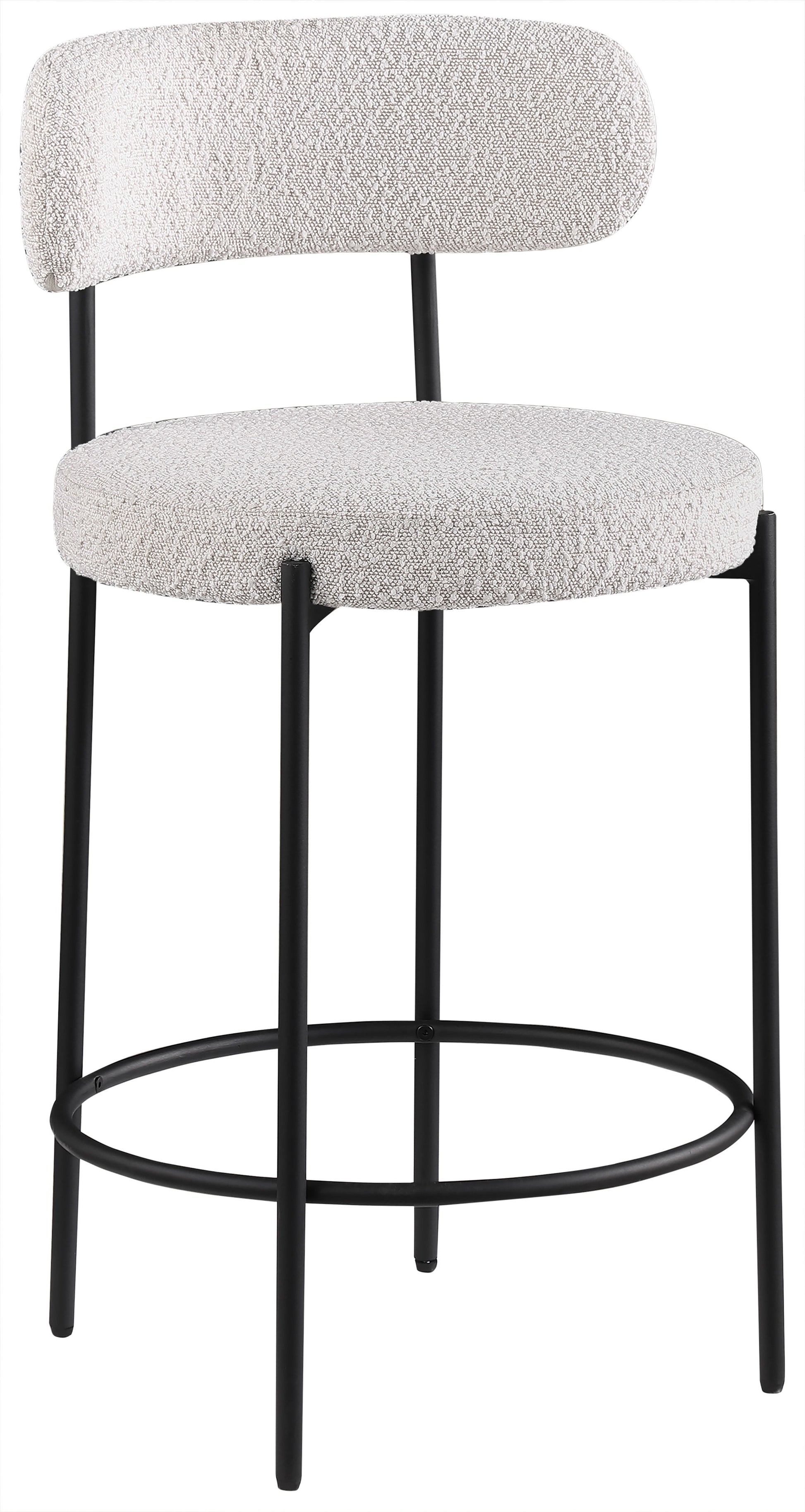 Make family, friends, and guests want to stay 'till closing time when they're seated on these Beacon boucle fabric bar stools/counter stools. These handsome stools are just the thing your kitchen counter or home bar is missing, with their ultra-modern design and beautiful look. The curved backs support the body while you sip a frosty cold one or nosh on some breakfast fare. A matte metal frame gives the stools' design durability while the boucle fabric adds a touch of softness and comfort.