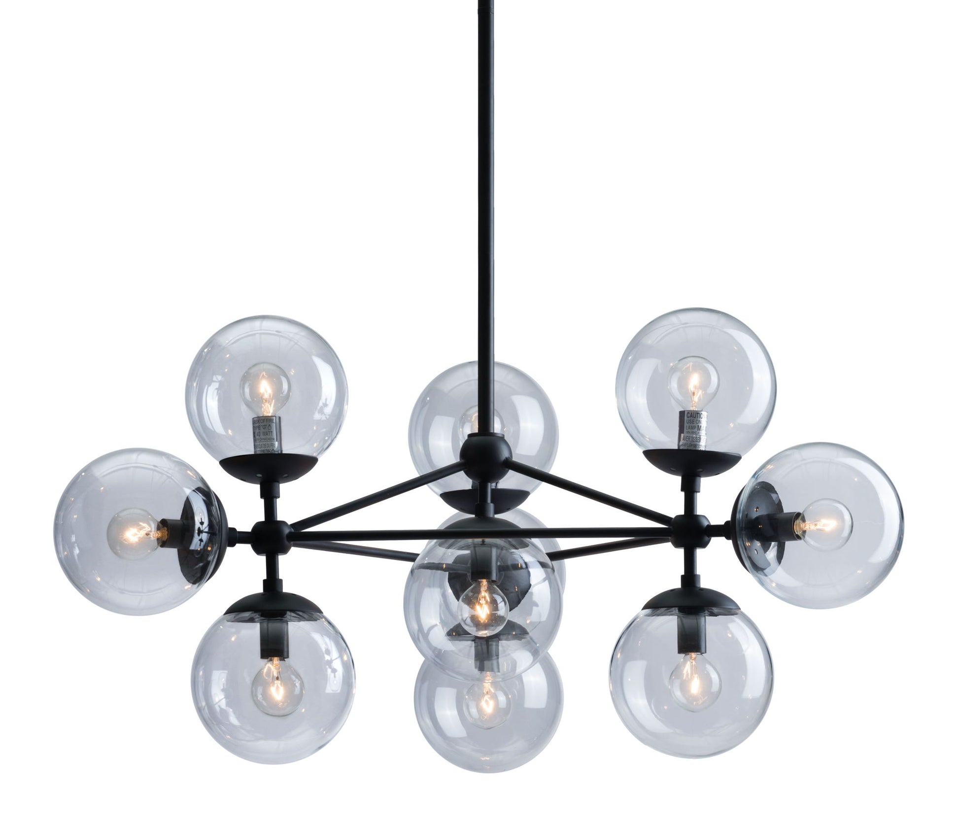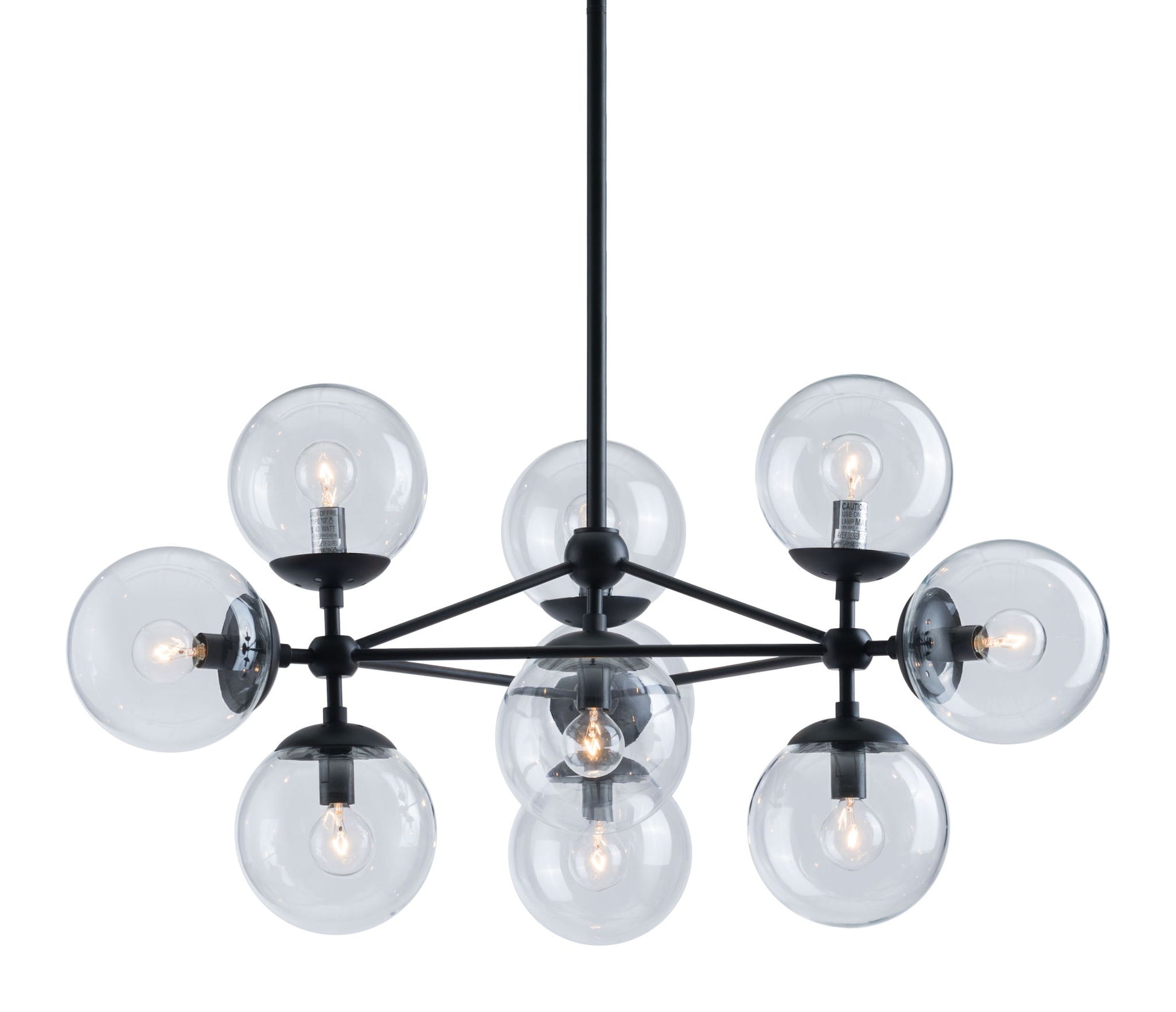 Mid-century inspiration results in this ten-light modern masterpiece. Its black metal frame with a dimensional three-point design and clear glass globes make it so versatile. It will hang perfectly over a dining table & look stunning in an entry. The perfect choice to beautifully illuminate any space.