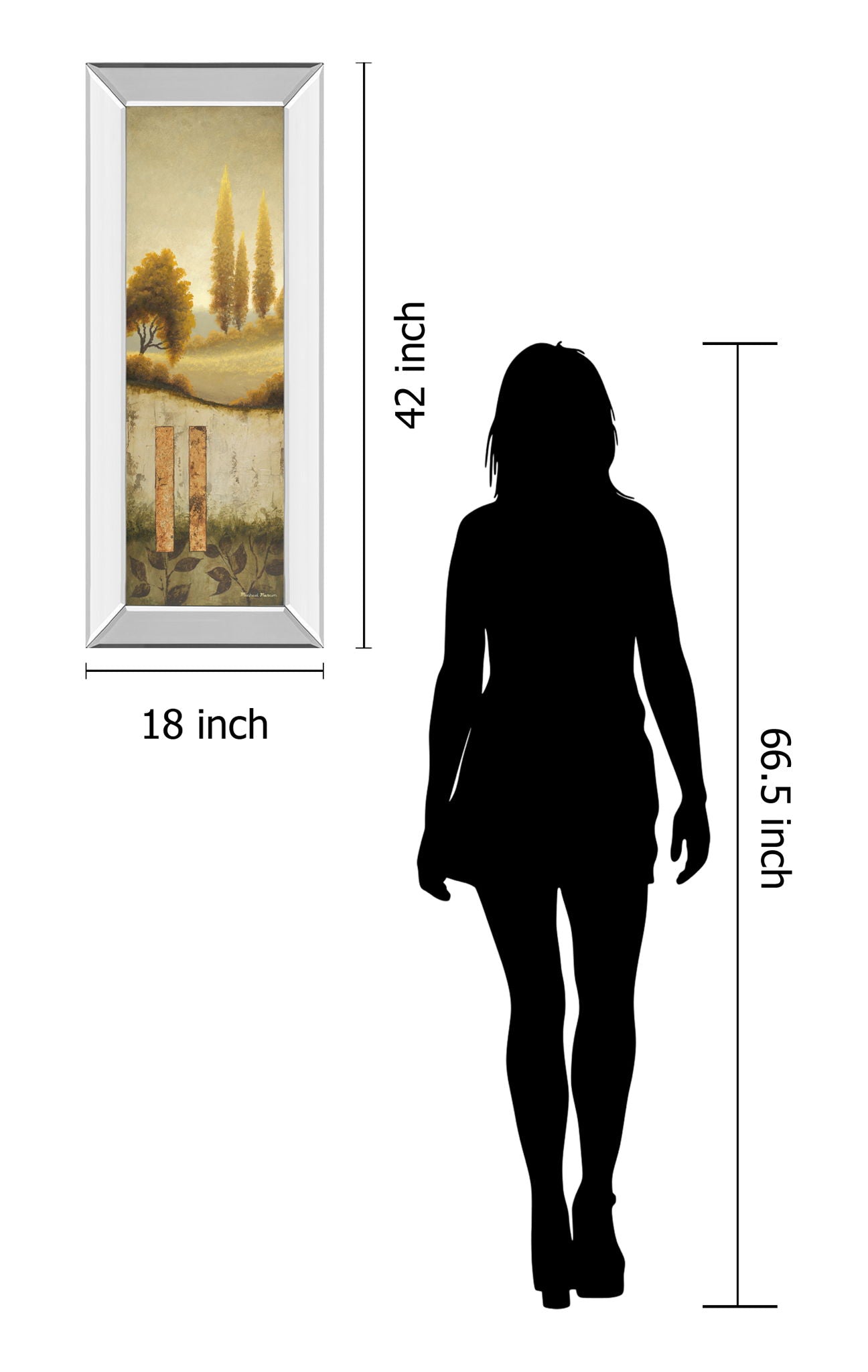 Step into a tranquil landscape where golden hues and gentle textures invite a sense of calm and reflection. This artwork captures a serene countryside scene with tall, slender trees and a softly rolling hill, rendered in warm earth tones that evoke the quiet beauty of nature. The mirrored frame adds a modern touch, enhancing the depth and luminosity of the piece while protecting the mixed media print beneath real glass. Perfectly sized for living rooms or bedrooms, this framed wall art blends contemporary elegance with timeless natural charm, creating a peaceful focal point for any space.