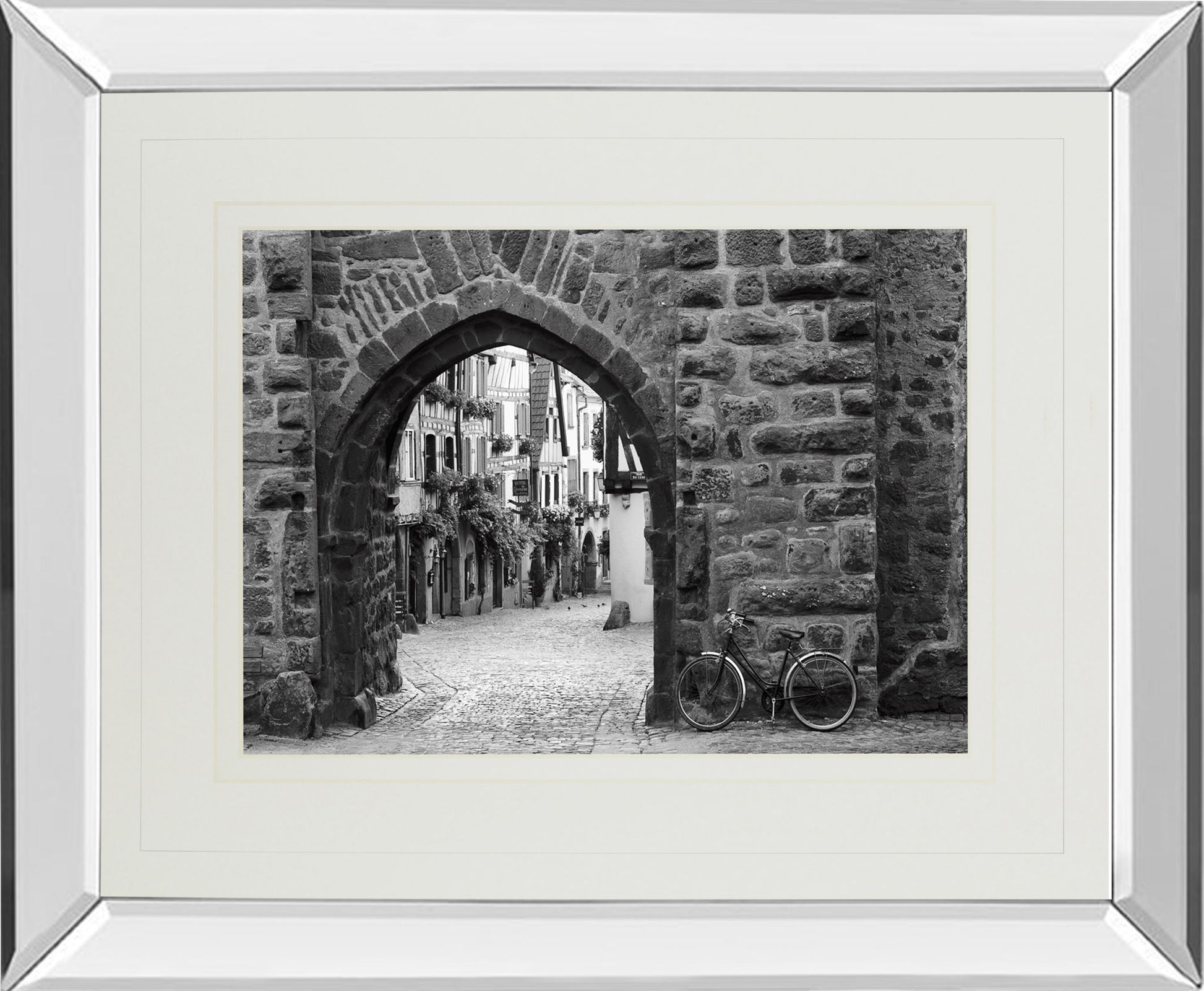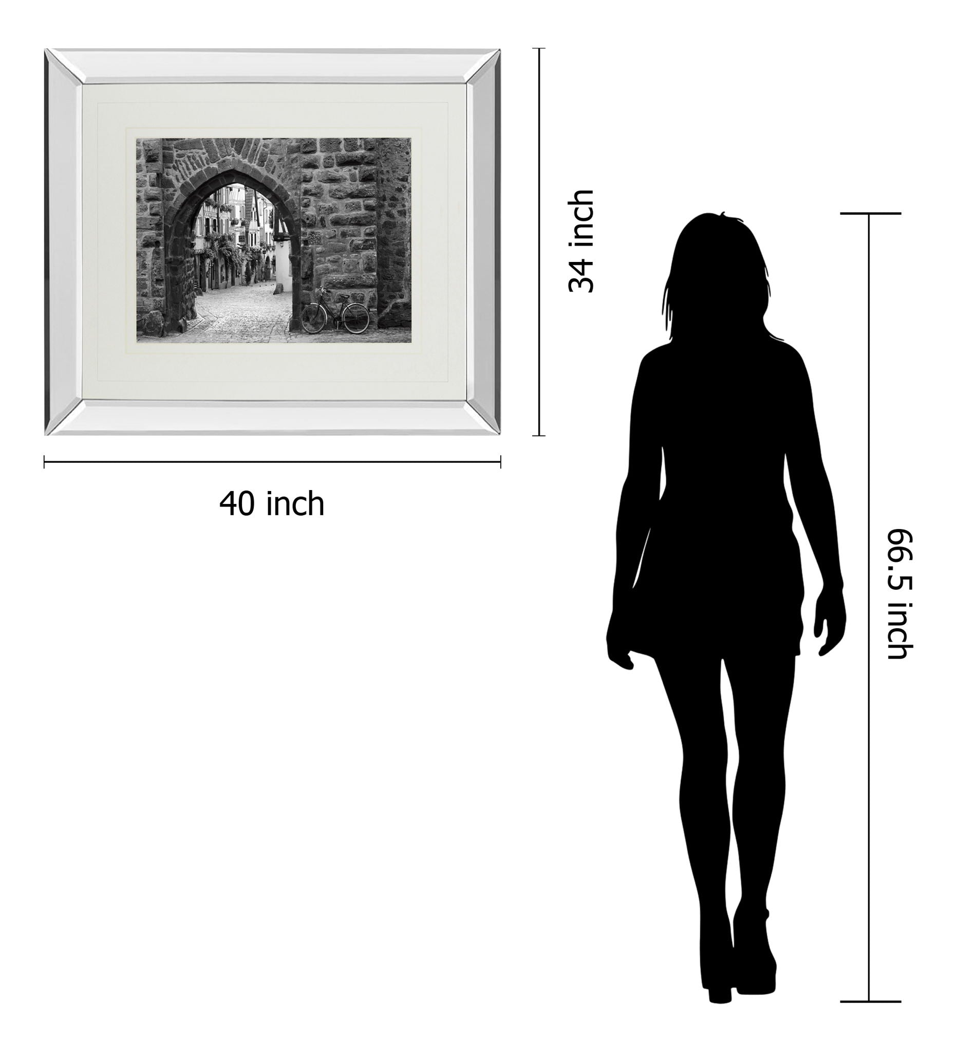 Step into the serene beauty of a historic European village with this captivating black-and-white photograph. The image showcases a timeless stone archway opening onto a cobblestone street, where a vintage bicycle leans quietly against the textured wall, inviting memories of leisurely strolls and quiet moments. Set within a sleek mirrored frame, the artwork balances classic charm with modern elegance, enhanced by double cream matting and protected by real glass. Perfect for living rooms or offices, this piece brings a refined gallery feel and a touch of nostalgic wanderlust to your space, blending architectural grace with contemporary style.
