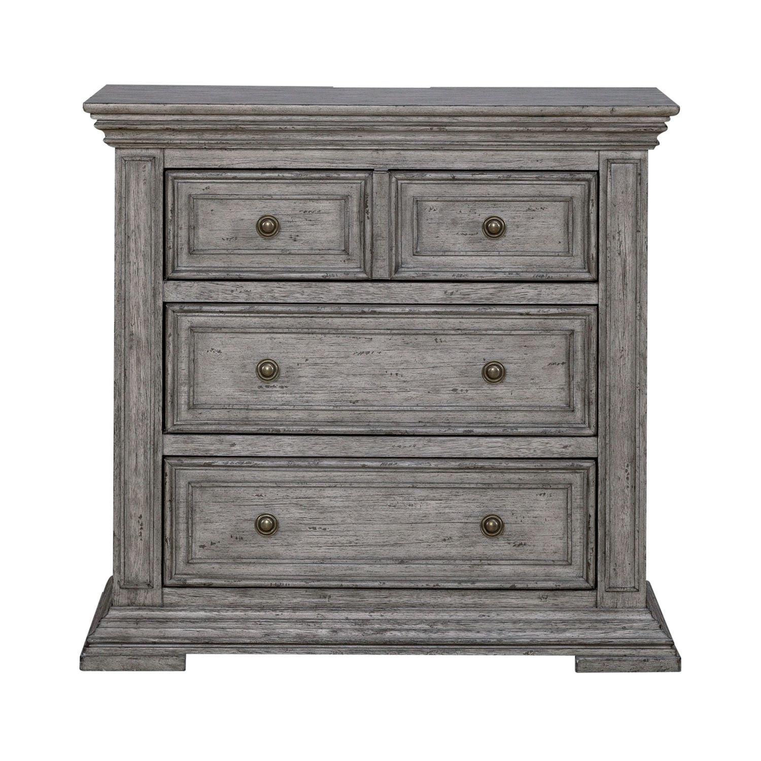 Incorporate this traditional, large scale bedside chest into your bedroom. The finish features heavy distressing, characterized by warm and intricate details. Enjoy the convenience of having a built-in charging station in the back of the night stand, featuring two USB ports and two outlets. The wood framed drawer fronts and block feet complete this traditional look, combing for a grand feel of the past with today's luxurious lifestyle.