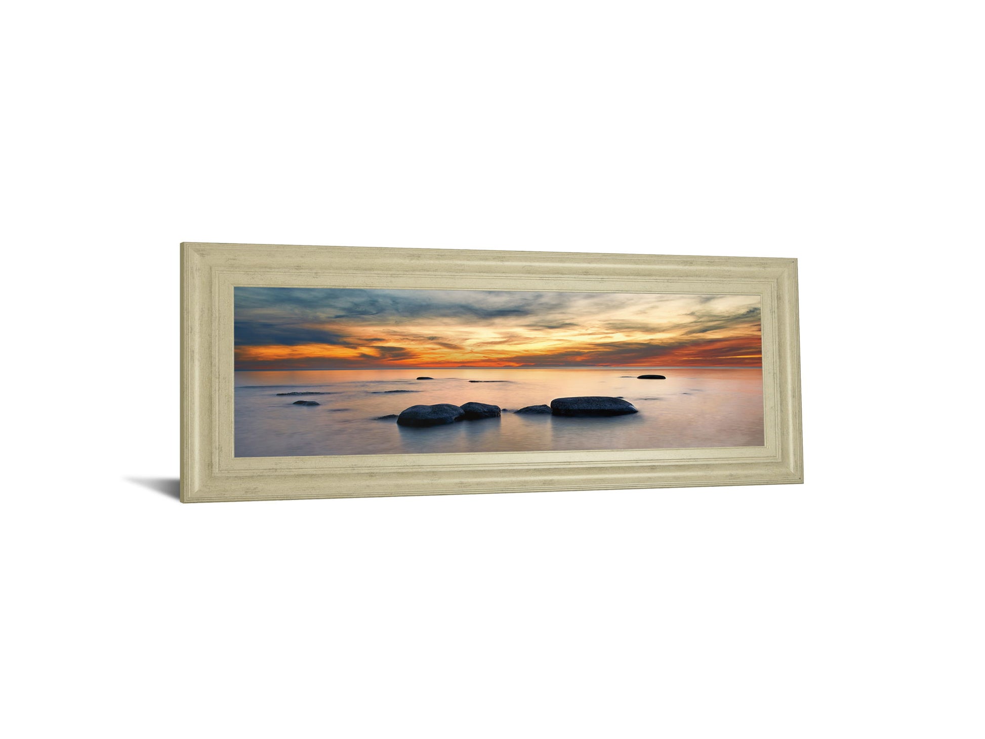 Step into a moment of serene beauty with this captivating coastal scene, where smooth rocks gently emerge from a calm sea beneath a stunning sunset sky. The soft blend of orange, blue, and neutral tones invites a peaceful ambiance, perfect for creating a calming retreat in your living room, bedroom, or office. Framed in a wide, elegant mirrored frame, this photographic artwork offers a sophisticated touch of nature’s tranquility, expertly crafted with real glass and ready to hang for effortless style and relaxation.