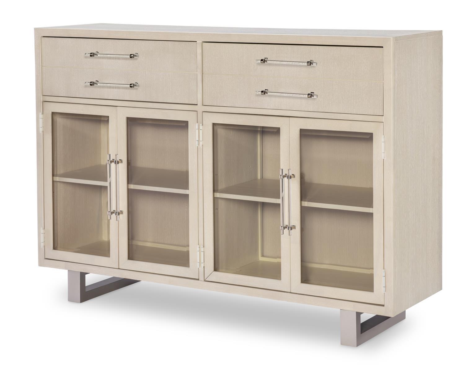 Bliss is a casual contemporary collection offering bedroom, dining, and occasional options. A beautiful mixture of finishes on modern silhouettes gives the group a unique styling with a touch of glam. A Soft Cashmere finish on Quartered Oak in eye-catching veneer patterns mixed with Champagne colored accents adds a high-end look. Clear acrylic hardware finishes off each piece. Simple forms and straight lines add to the more contemporary tone.