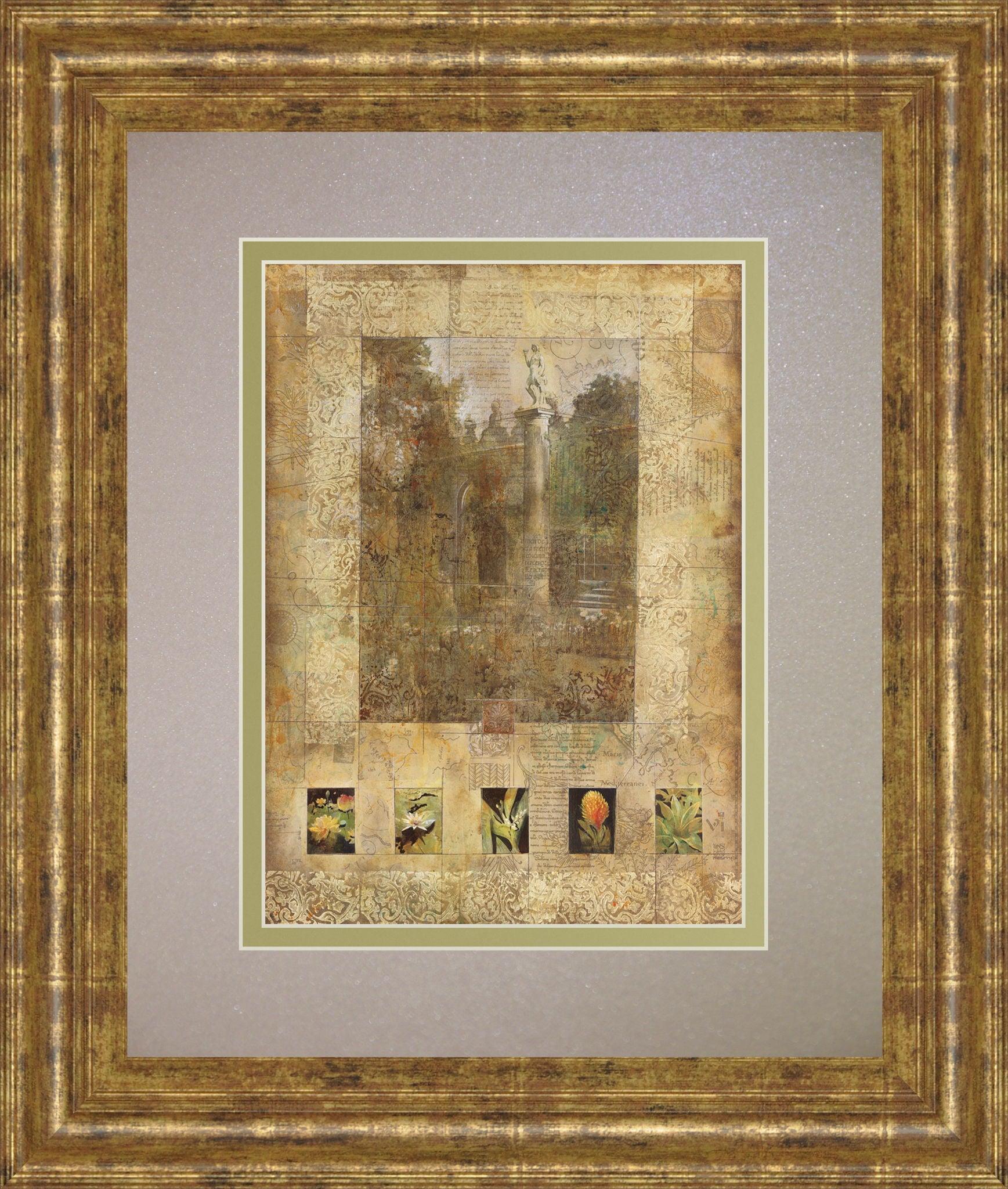 Step into a serene garden where history and nature intertwine in this captivating piece. Soft, muted tones of beige, gold, and green create a vintage-inspired collage that invites quiet reflection. The rich gilded frame and double-matted design add layers of depth and elegance, making it a perfect addition to living rooms, offices, or bedrooms seeking a touch of timeless beauty and subtle sophistication.