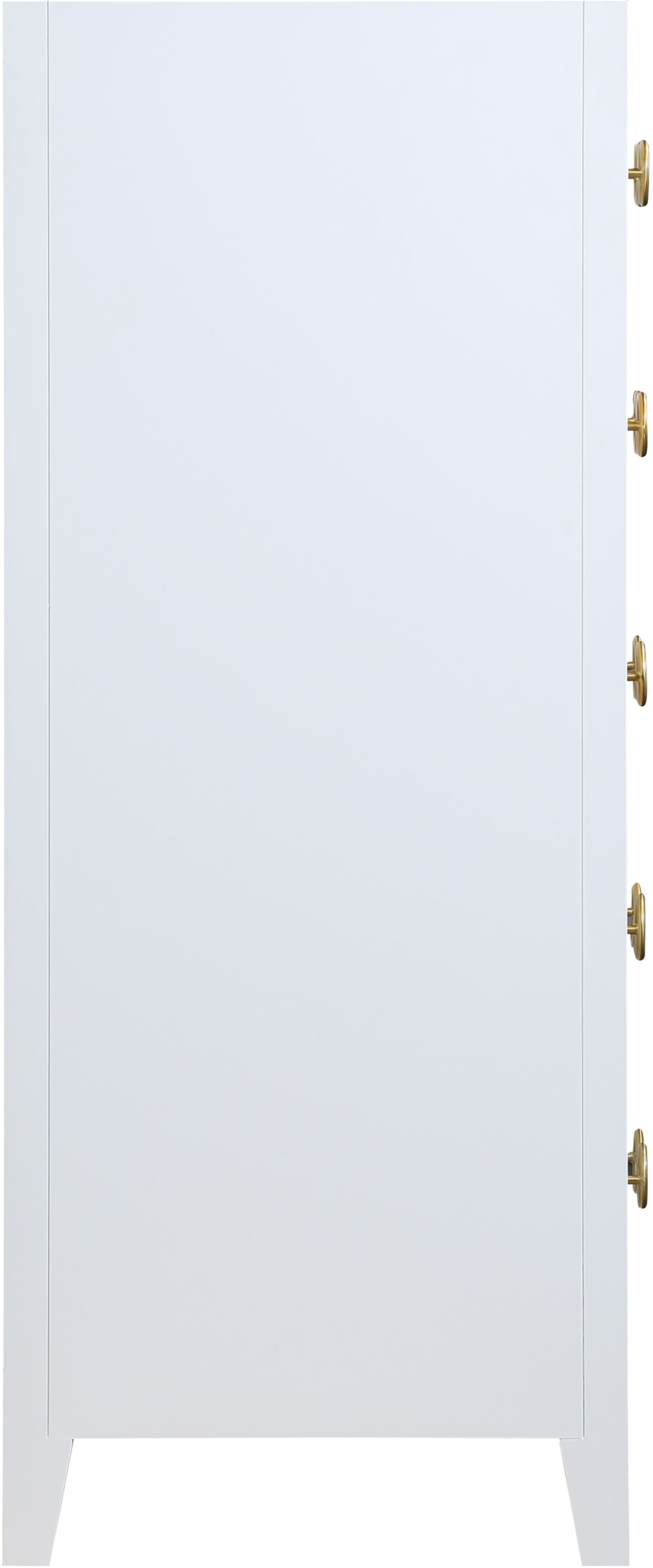 Bring unique elegance to your bedroom with this Bowtie chest from Meridian Furniture. This chest features five drawers, providing you with plenty of storage space for clothes, linens, or miscellaneous objects. Its light color adds a touch of femininity to your living space, and its brushed bow tie handles complement your existing decor. Its flat top is perfect for placing a lamp, framed picture, books, bric-a-brac, and more.