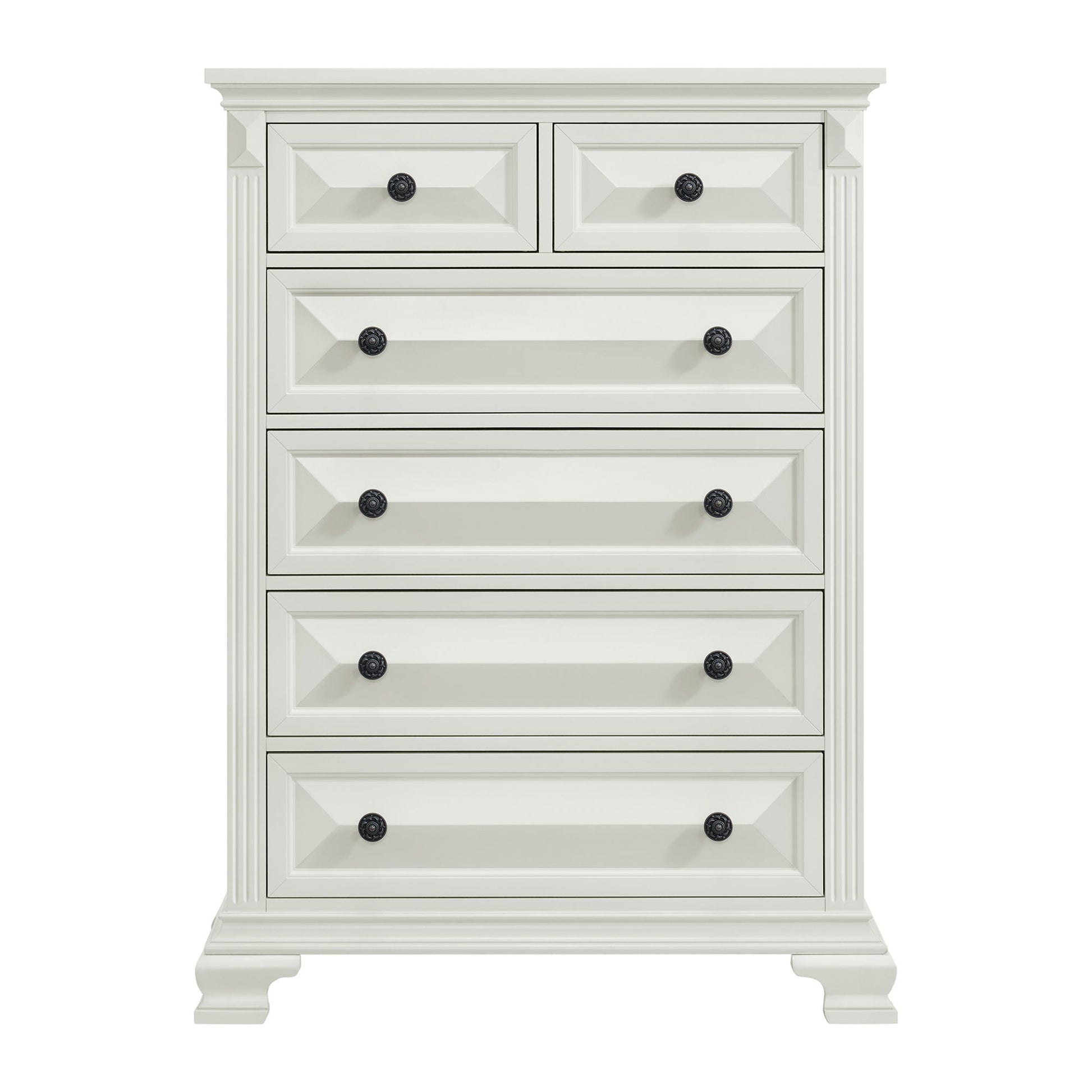 The Bridgestone 6-Drawer Chest is the perfect addition to any bedroom. This case piece is designed with beautiful beveled design throughout, adding a touch of elegance to your decor. The finish features faint distressing for a unique look, while the metal knob hardware adds a contrasting touch. The top drawers are lined with felt to protect delicate items, while the bottom drawer features cedar veneer for added durability. With ball bearing drawer guides and an anti-tipping kit included, this chest is as functional as it is stylish. Bring sophistication and organization to your bedroom with this piece from the Bridgestone collection.