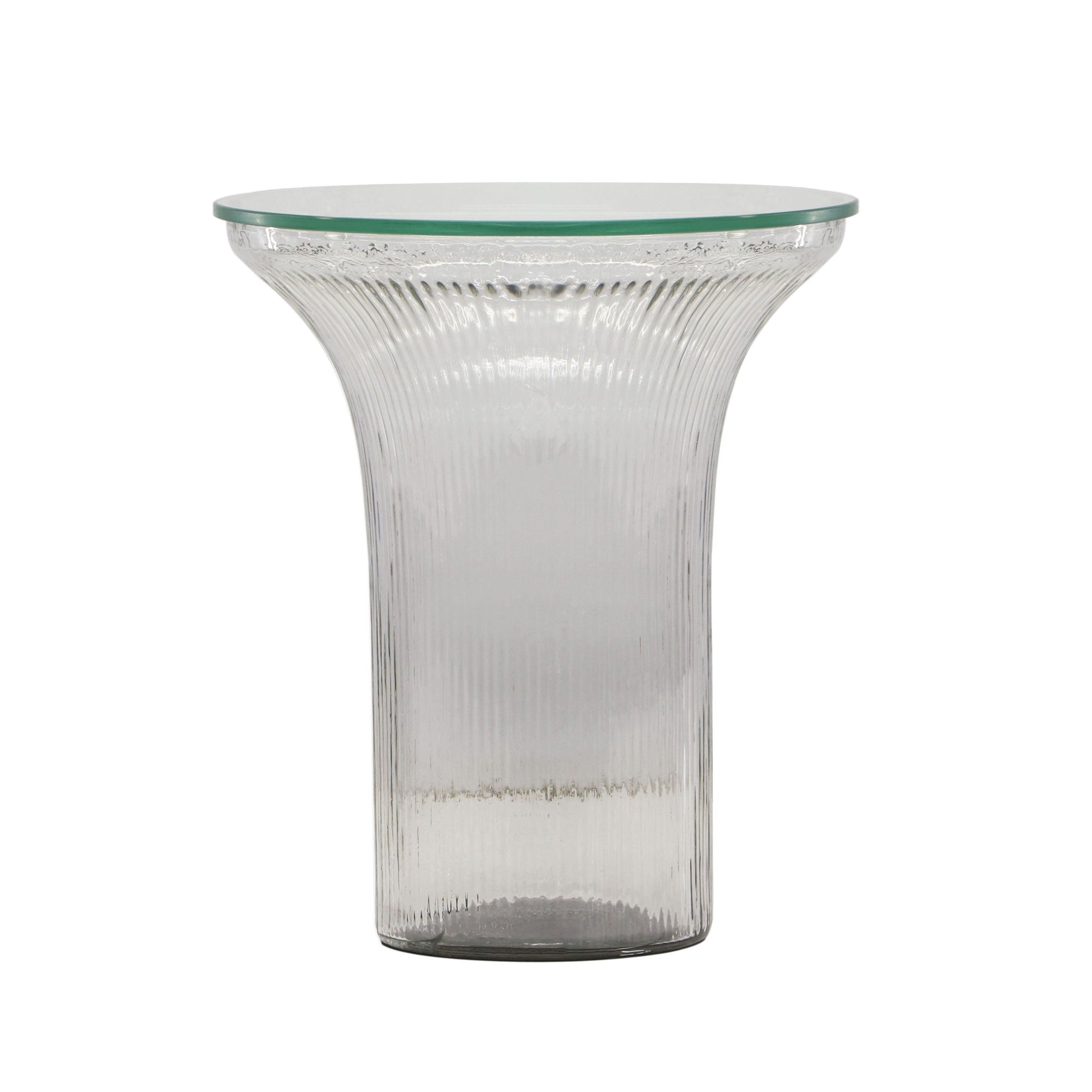 Introducing the Cassandra Glass Flared Side Table, a captivating blend of nostalgia and modern design, available in midnight blue or transparent clear glass. With its retro-inspired curved silhouette and ribbed glass detailing, this side table effortlessly adds a touch of vintage charm to any space. Crafted from hardened glass, achieved through rapid cooling of molecules, it ensures exceptional durability, making it resistant to breaking or cracking. Plus, the soft base provides protection against scratches, making the Cassandra Side Table both stylish and practical for your home.