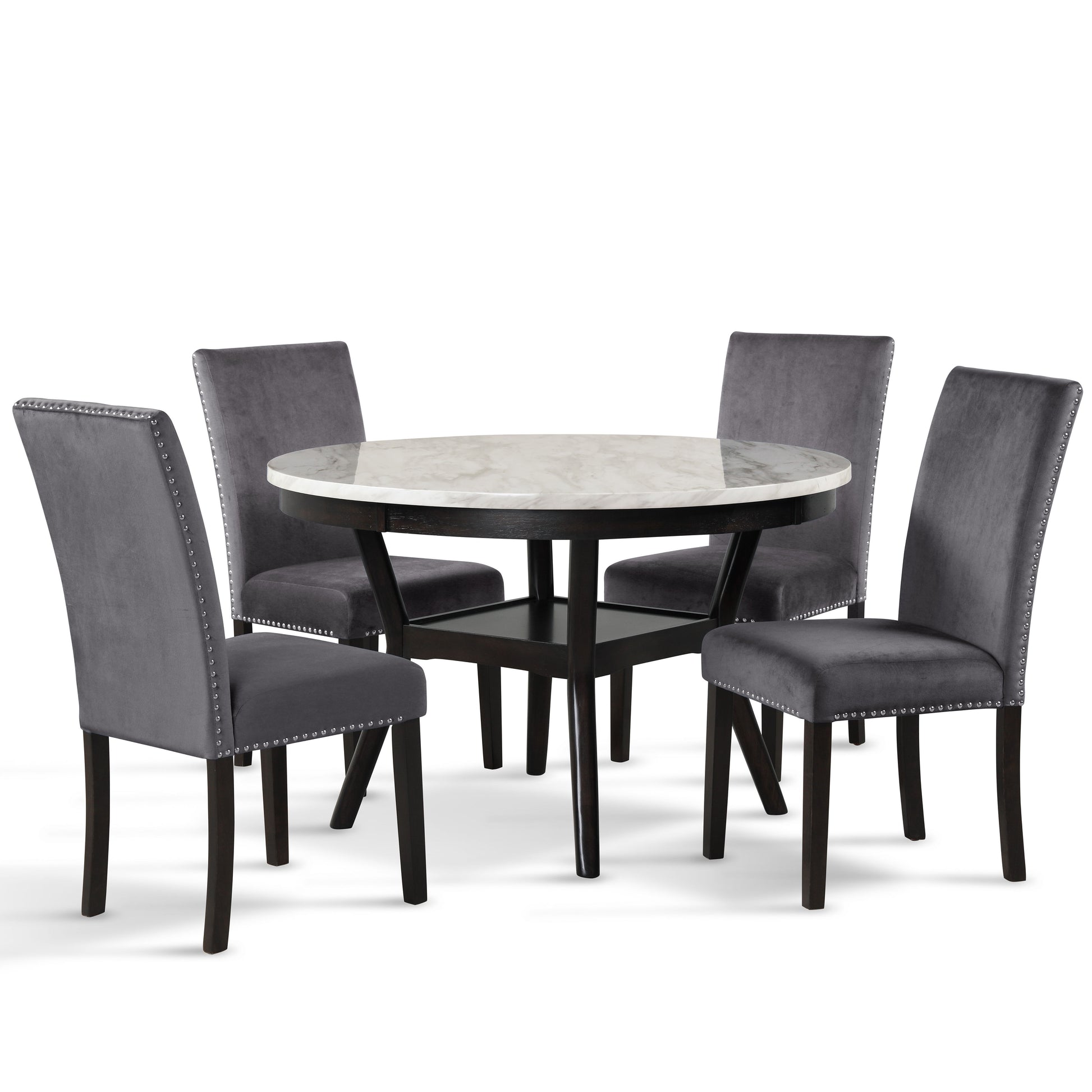 The Celeste Dining Set is an exquisite combination of modern sophistication and enduring craftsmanship. This set includes a chic round dining table with an espresso base and a faux marble top, accompanied by four stunning velvet chairs. Crafted from solid Rubberwood and high-quality manufactured wood components, the dining set is designed for longevity, ensuring a lasting addition to your dining space. The glossy finish on the tabletop provides both heat and water resistance, ensuring easy cleaning and protection from wear. The white and gray veined faux marble top, complemented by deep espresso legs, creates a contemporary and glamorous ambiance. Luxurious seating awaits with the soft and durable 100% polyester velvet fabric covering sumptuous memory foam cushions, offering both comfort and easy maintenance. Tailored for elegance, the rich and luxurious colors of the velvet chairs are enhanced by silver nailhead trim, providing a sparkling final touch to this impeccable dining set. Elevate your dining experience with the Celeste dining set—a fusion of contemporary glamour and enduring quality.