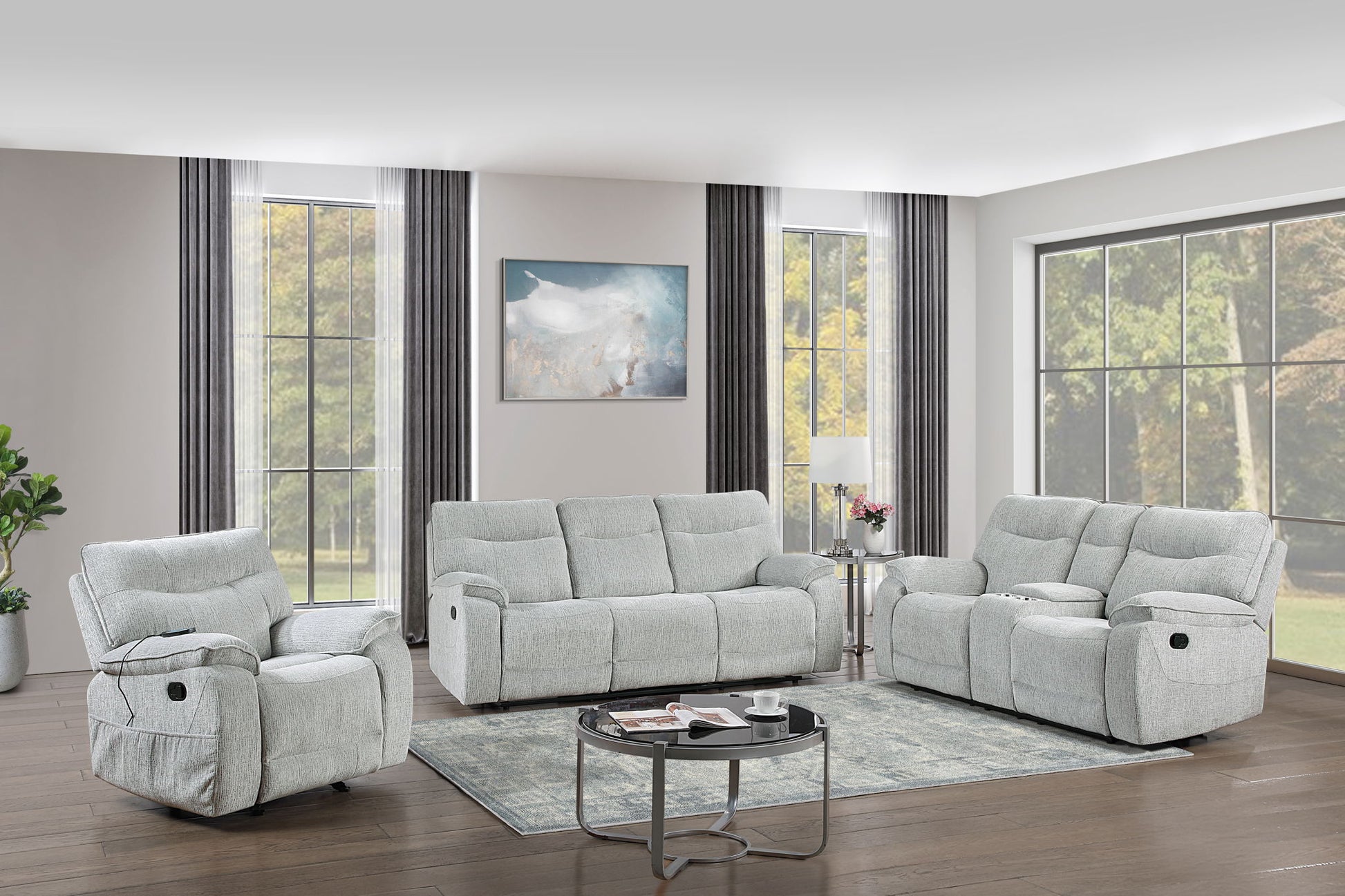 Transform your living space with the Chablis Soft Gray 3-Piece Motion Living Room Set, designed for ultimate comfort and convenience. This luxurious set includes a dual-reclining sofa, a reclining console loveseat, and a heat/massage glider recliner, offering everything you need to relax in style. Crafted with hardwood and plywood interior frames and sturdy motion mechanisms, it ensures durability and long-lasting support. Wrapped in 100% polyester, easy-care mist gray fabric, this set provides an indulgently soft and cozy seating experience. The resilient springs and plush foam cushions offer the perfect balance of comfort and durability, retaining their shape for years to come. Sink into the generously cushioned recliners, with the glider recliner featuring heat and massage functions for soothing relaxation. Thoughtful lifestyle enhancements include the loveseat’s built-in cupholders, a spacious storage compartment, and USB A/C charging ports in all pieces, keeping everything you need within reach. Elevate your home with the perfect blend of style, comfort, and modern convenience.