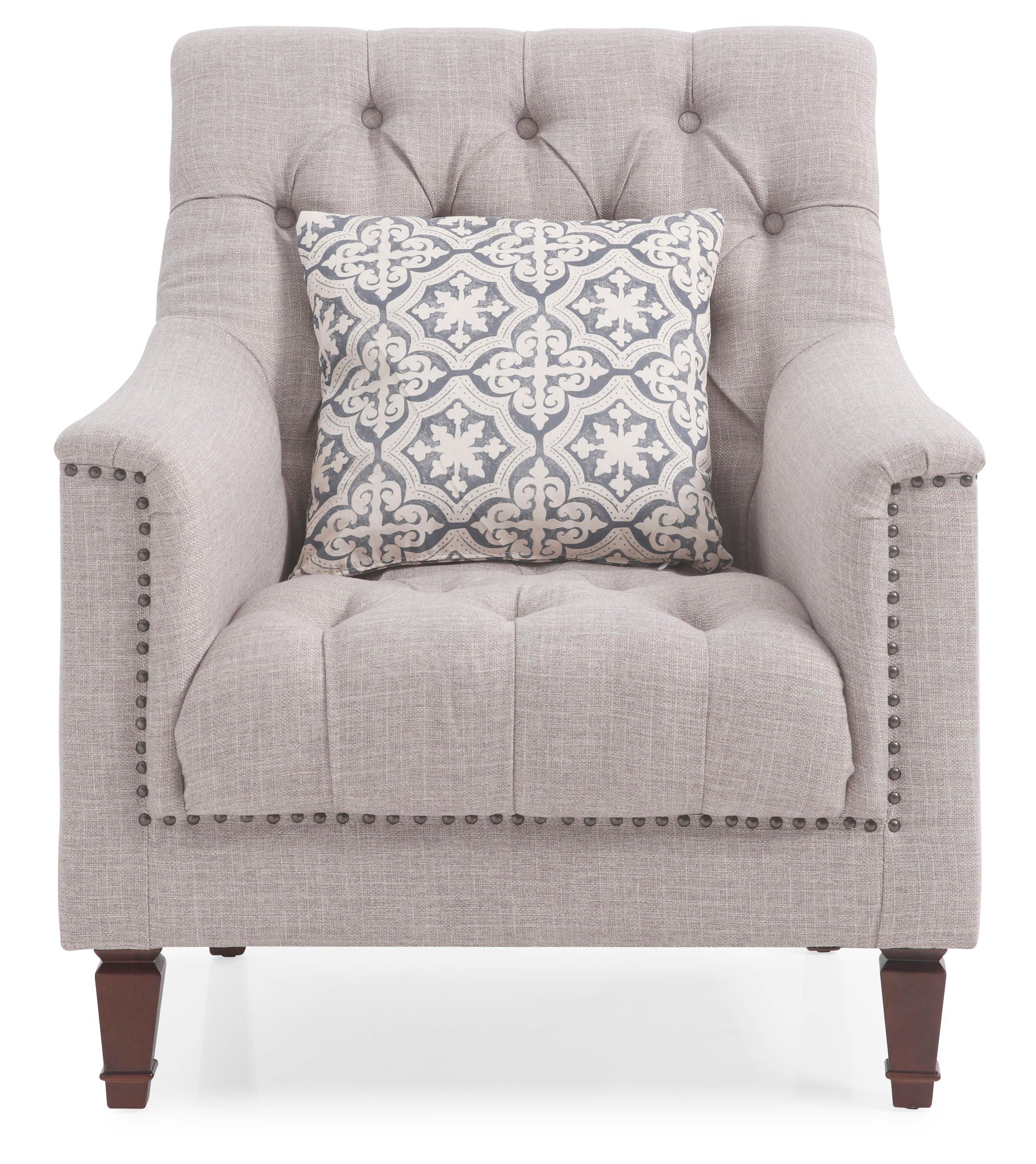 Introducing the G850-C chair from Glory Furniture, a remarkable blend of traditional and modern design elements. This chair features a lovely light gray fabric that seamlessly integrates with a variety of interior styles, making it a versatile addition to any room. The deep tufted fabric on both the inside back and seat not only enhances its visual appeal but also invites you to sink into comfort. Intriguingly adorned with antiqued nail heads, this chair brings a classic charm that draws the eye and sparks conversation. The thoughtfully crafted wood legs provide exceptional strength and stability, ensuring this chair is as functional as it is beautiful. With overall dimensions of 37 inches in height, 31 inches in width, and 31 inches in depth, this chair is designed to fit comfortably in smaller living areas or larger spaces. The included coordinated throw pillows complete the aesthetic, inviting you to experience relaxation and style all in one. This exceptional piece is not only a chair but also a statement for your home.