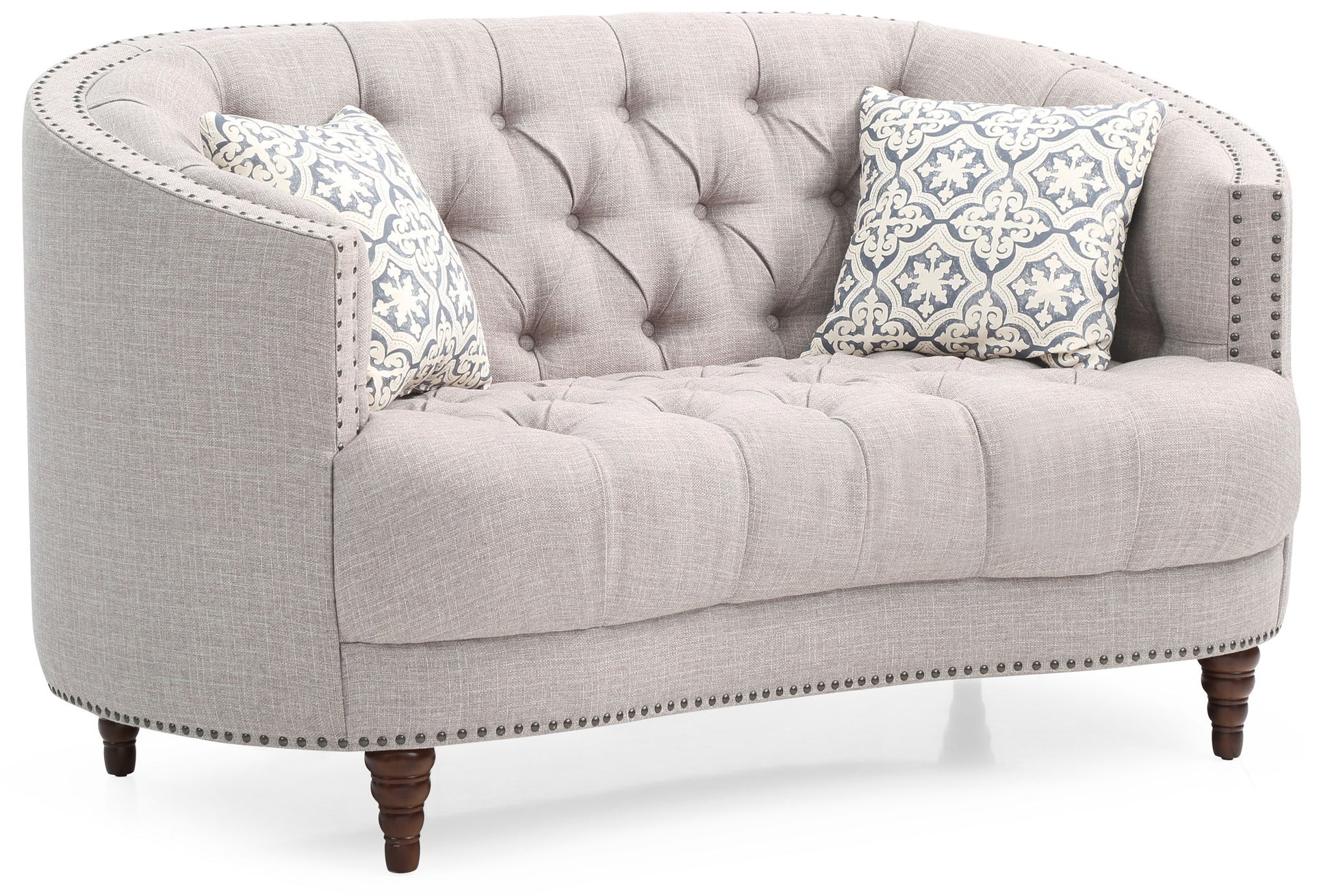 Discover the Light Gray Loveseat, an impressive combination of modern style and comfort. Featuring deep tufted fabric on both the back and seat, this loveseat creates a welcoming spot in your living area. Its light gray upholstery is versatile enough to complement a variety of decor styles, making it an essential piece for any home. The soft fabric is designed for both visual appeal and comfort, ensuring a cozy experience for everyone. The loveseat includes unique antiqued nail heads that enhance its charming retro look, providing an attractive focal point while adding texture to the overall design. Built on robust wood legs, it ensures a strong foundation without sacrificing aesthetics, helping it stand up to daily use. With overall dimensions of 36"H x 63"W x 37"D, this loveseat is designed to fit seamlessly in various spaces while offering generous seating. The included coordinated throw pillows provide additional comfort and style, making it an excellent choice to enhance your living room environment.