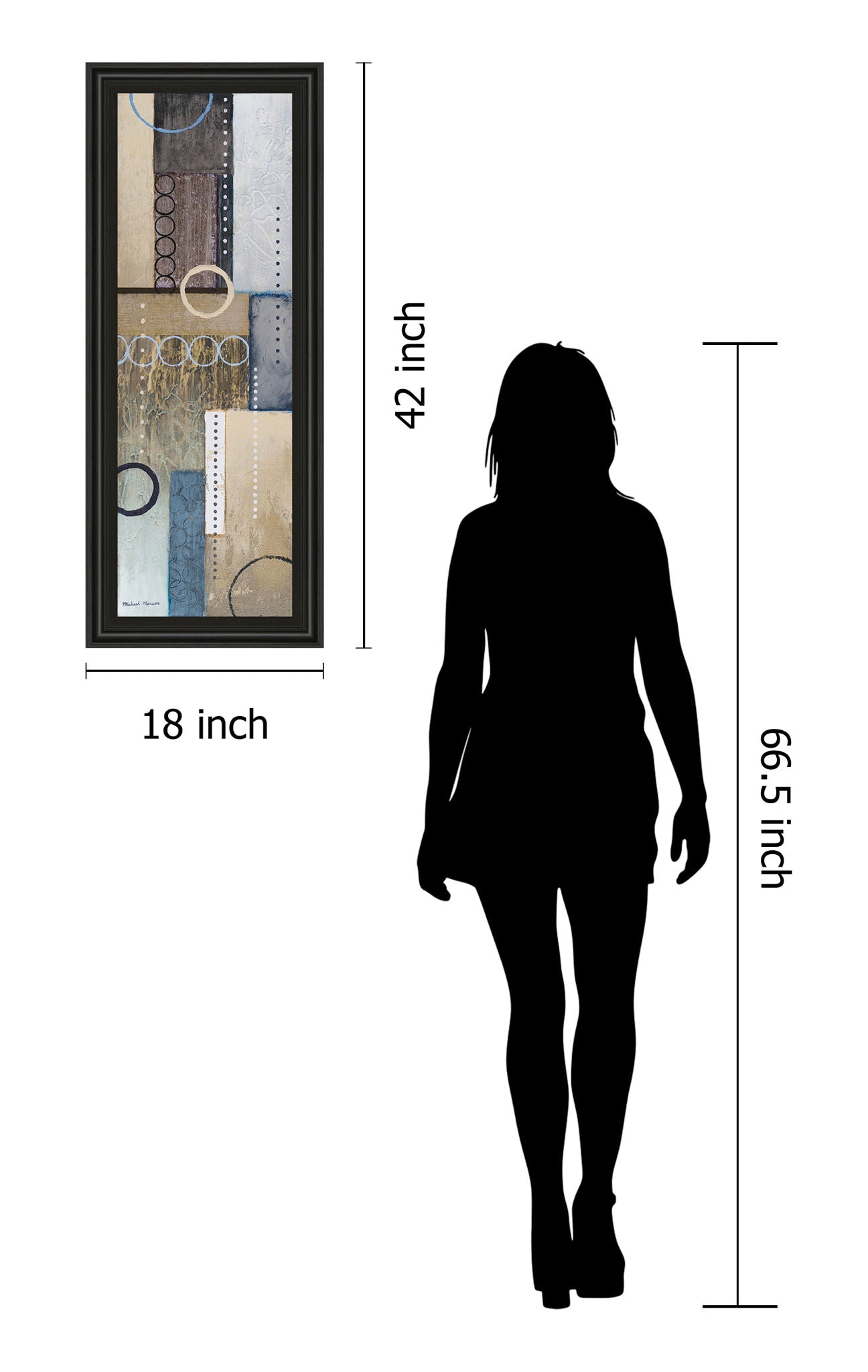 Rainfall Harmony invites you into a serene world where muted tones and textured layers converge in a contemporary abstract composition. This mixed media piece elegantly balances circles and rectangles in shades of beige, blue, gray, and black, all framed by a refined midnight aura finish that deepens its visual allure. Measuring 42 by 18 inches, it fits effortlessly into living rooms, offices, or bedrooms, offering a tranquil yet dynamic presence. Crafted with premium materials and protected by crystal-clear glass, this framed wall art arrives ready to hang, embodying timeless sophistication and artistic depth.