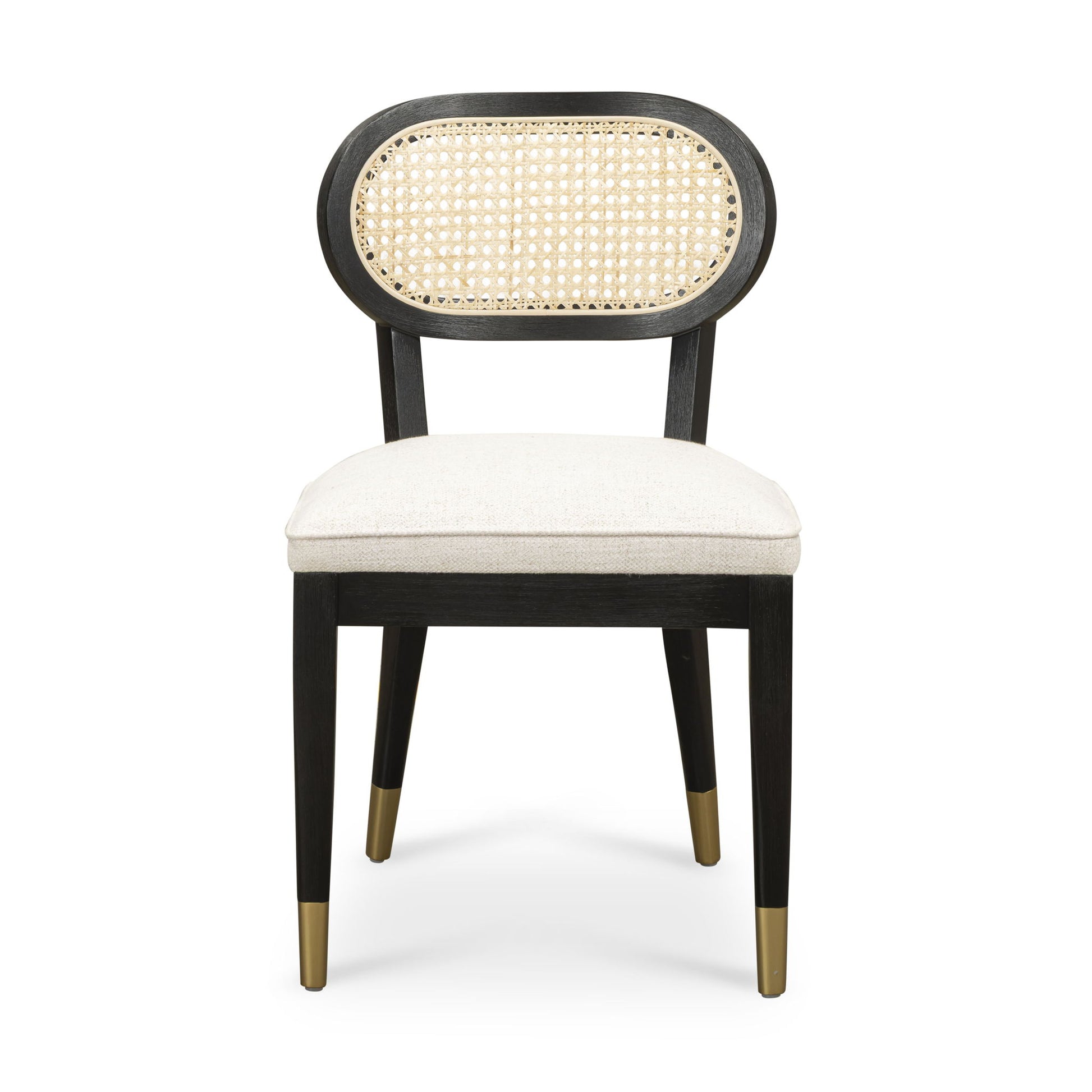 The Cosette Dining Chair is back with a bold twist. Crafted in sleek black wood and paired with a performance cream upholstered seat, it brings modern contrast to timeless mid-century lines. With its sculpted proportions, stunning cane back, and brass-capped legs, Cosette blends comfort and sophistication into a piece that feels fresh, refined, and forever stylish.