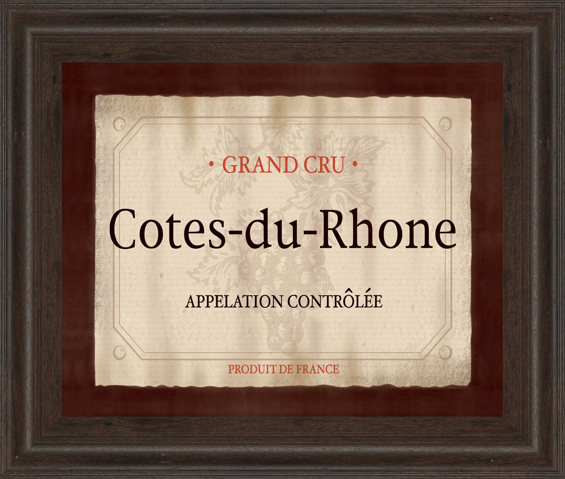 Step into the heart of French wine country with this elegant Cotes-du-Rhone framed wall art. Featuring classic typography and a vintage-inspired label design, it captures the essence of traditional wine culture with subtle hues of brown, beige, and red. The rich cinnamon mocha frame and premium real glass add a warm, sophisticated touch, making it an ideal accent for kitchens, dining rooms, or home bars. Crafted with care in the USA, this piece blends timeless charm with transitional style, perfect for those who appreciate the art of wine and refined home decor.