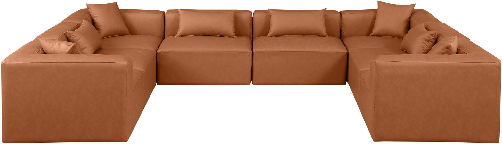 Elevate your space with the luxurious Cube Vegan Leather Modular Sectional. This modular sectional exudes modern elegance, charm, and comfort making it a perfect addition to any contemporary living space. Its clean lines and cube shape are reminiscent of minimalist design, while the plush cognac vegan leather upholstery adds a touch of luxury and sophistication. The chair's versatile construction and geometric aesthetic seamlessly integrate into various design styles, from sleek living rooms to chic home offices, embodying the essence of modern design and creating a sense of order and tranquility in your space.