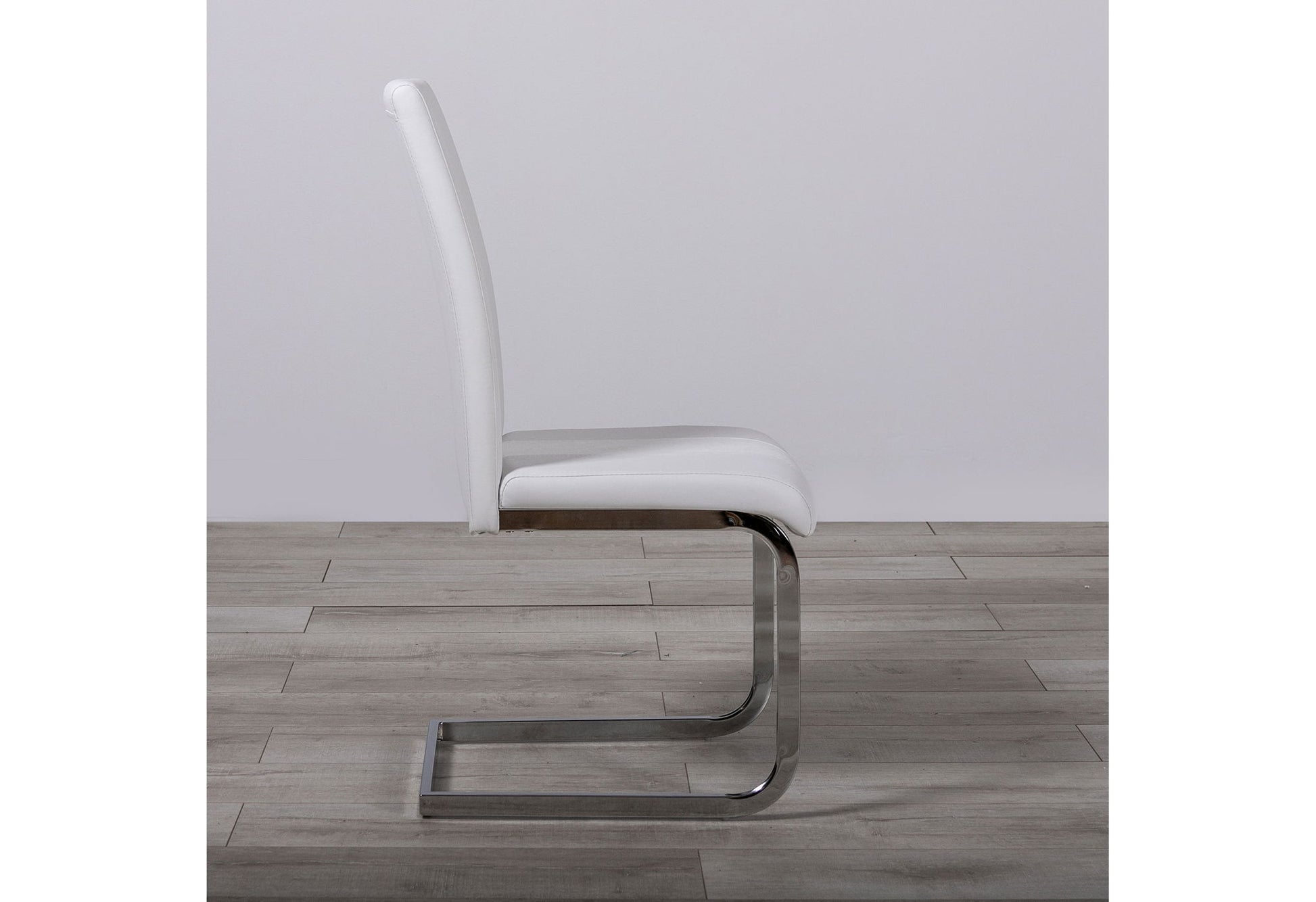 Perfect for your kitchen or breakfast nook, this two-toned dining chair will transform your room and add comfort and charm. This chair is upholstered in tones of white faux leather (PU) and fabric, providing an eye-catching and modern twist to traditional kitchen seating. Decorating possibilities are endless with the attractive tones of this chair. Additional design elements include a sleek style silver toned metal base and ample padding, continuing the delightful look and comfy feel of this seating. Quality craftsmanship in every facet of production ensures durability and long-lasting wear. For a stylish and modern take on kitchen or dining room furnishings, this chair is a can't miss choice in comfortable seating.