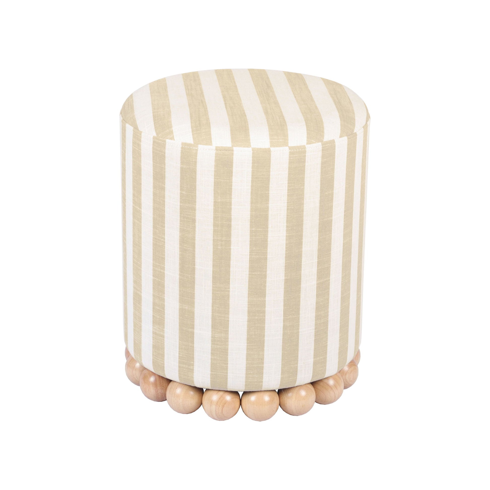 Meet the Dex Striped Linen Ottomans, a petite and playful addition to your space, combining fresh design with a tropical aesthetic. The solid wood spherical orbs on the base provide a unique aesthetic touch, ensuring a sturdy and stylish foundation. With washed linen-style cabana stripes, these ottomans bring a punch of personality to any space, offering additional seating or a stylish footrest. Available in Beige, Pastel Blue or Salmon Pink.