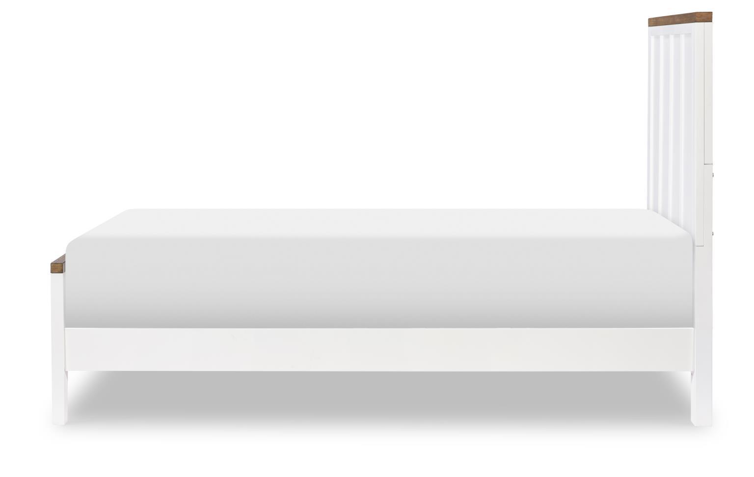 Crisp bold design and a painted finish create a modern farmhouse appeal in the Dutton Youth Bedroom by Legacy Classic - Youth. Crafted of Hardwood with Flat-Cut Oak Veneer tops and Birch Veneer bases the collection contrasts a painted finish on the cases with Toasted Oak tops. Accents include raised leg bases simple bar-pull hardware and a metal windowpane detail in the headboard.