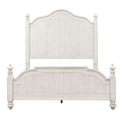 Fall into this cottage style Farmhouse Reimagined poster bed every night. The antique white finish features heavy wire brush distressing, creating a vintage cottage style. High/low veneer panels, shaped posts with decorative turned finials, and the scalloped cap rail add the perfect cottage charm, making this a bed that can work at your beach house or downtown studio. Bolt on rails and a center supported slat system ensure that this is a sturdy and reliable bed.