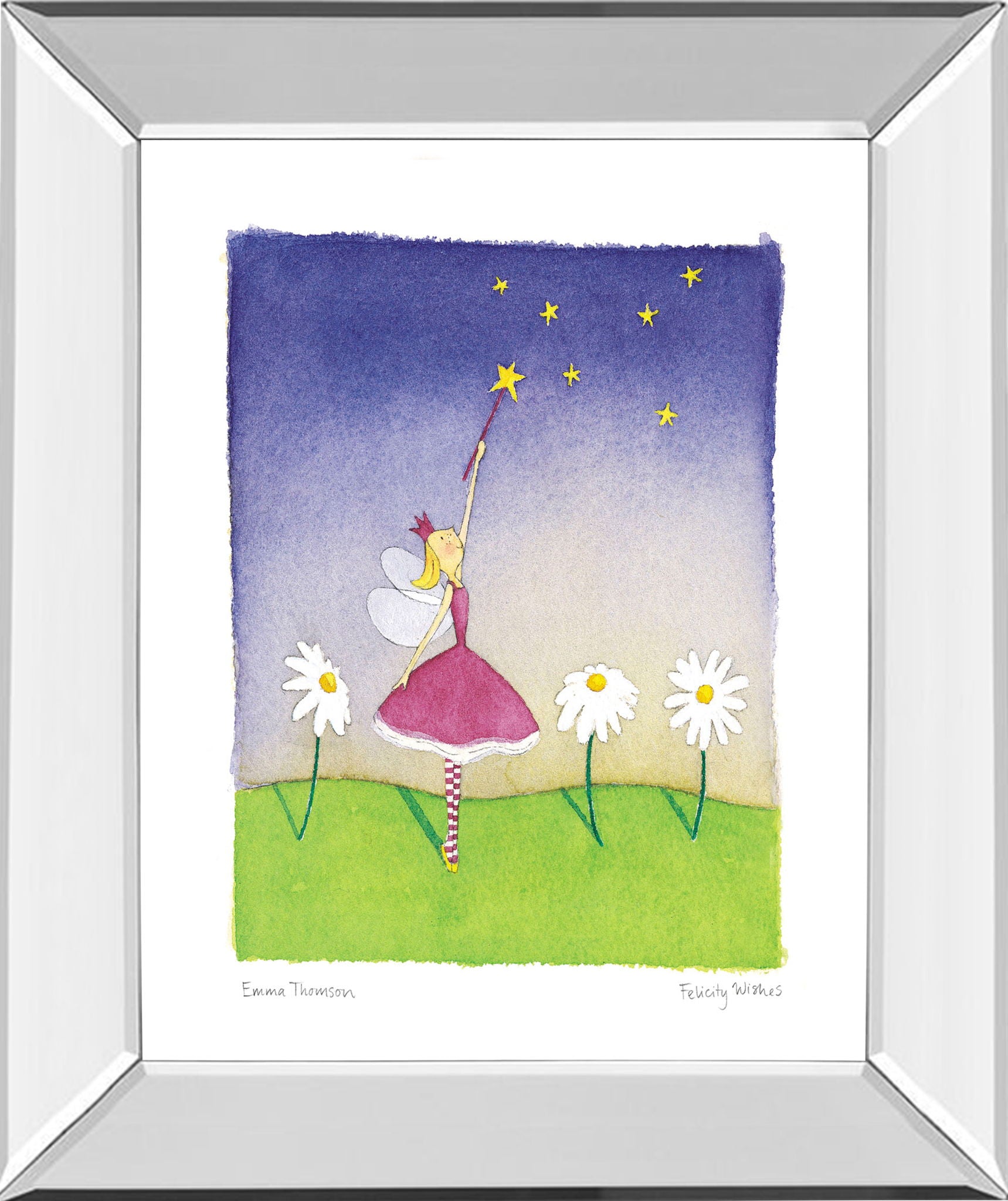 Step into a world of enchantment with this delightful wall art featuring a whimsical fairy reaching for shining stars. The vibrant gradient sky blends purples and soft hues, setting a dreamy backdrop for the playful figure dressed in a charming pink dress and striped stockings. Surrounded by cheerful daisies on a lush green field, this mixed media piece captures the innocence and magic of childhood imagination. Encased in a sleek mirrored frame, it adds a touch of modern elegance while reflecting light to brighten any nursery, playroom, or kids' space. Crafted with premium materials and real glass, this ready-to-hang artwork invites wonder and joy into your child’s room, making every day feel a little more magical.