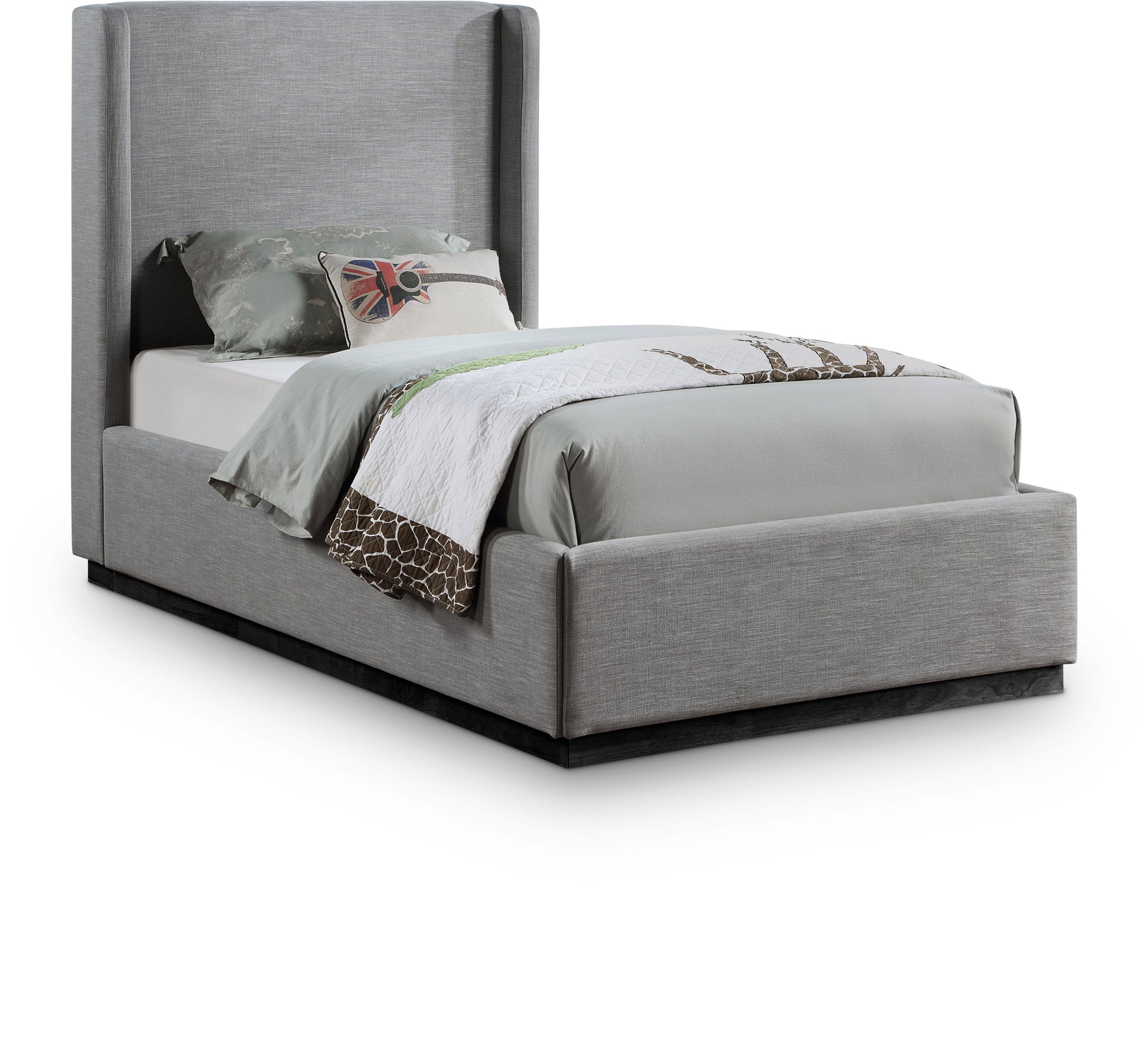Unwind and relax as the cares of the day drift away from the confines of this Flynn linen textured fabric bed. An artfully designed bedroom masterpiece, this bed offers a winged headboard that's extra tall to make a bold impression in your bedroom sanctuary. The linen upholstery fabric that covers this entire bed from top to bottom is soft to the touch, while the headboard is lightly padded for comfort as you read in bed or watch TV. A solid wood base provides sturdy support for this impeccably styed fabric bed.