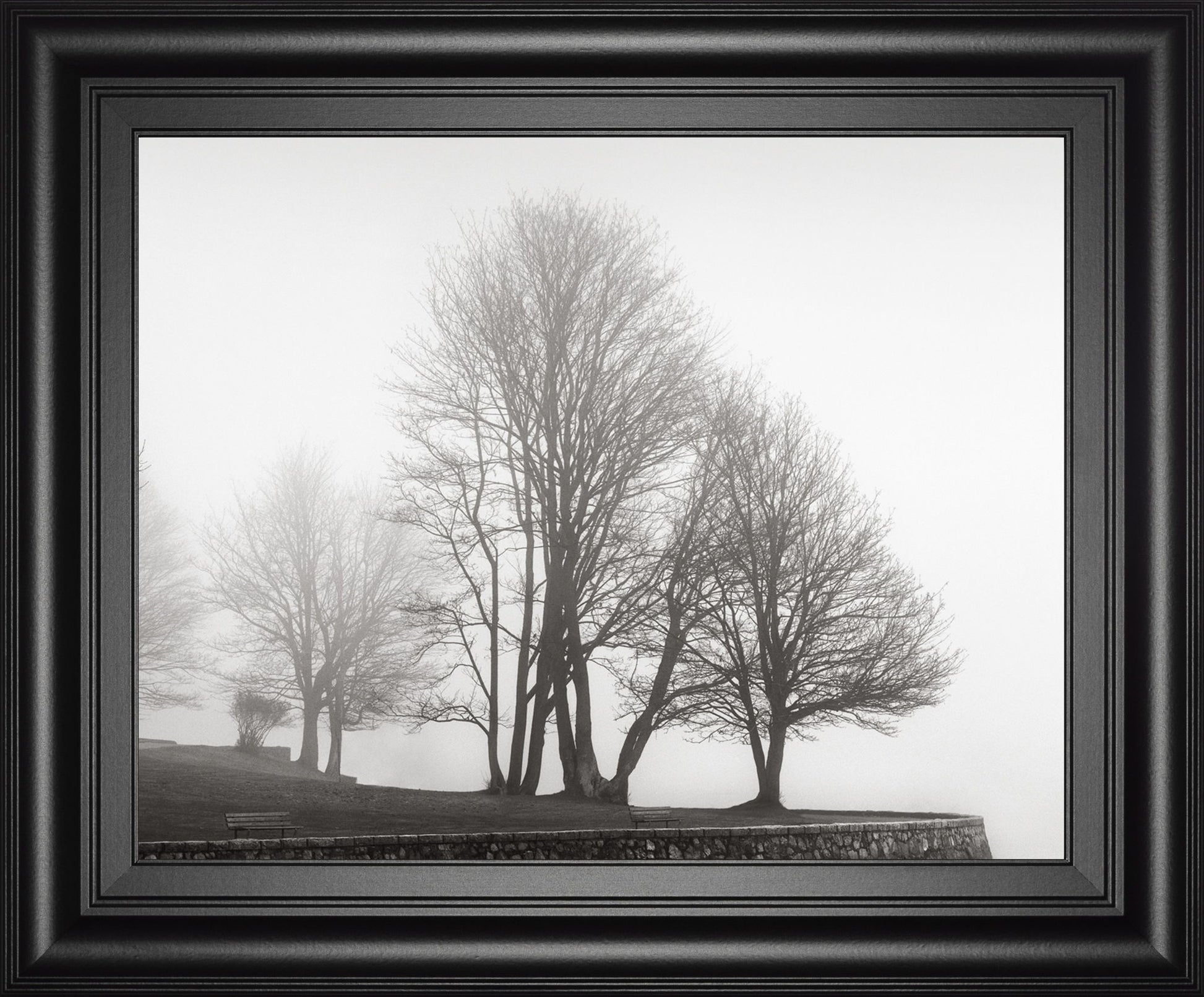 Step into a quiet moment where nature whispers its secrets through a veil of mist. This framed photograph captures the delicate silhouettes of bare trees standing tall against a soft, foggy backdrop at dusk, evoking a sense of calm and introspection. The subtle interplay of black, gray, and white tones creates a timeless scene that brings peaceful serenity to any living room, bedroom, or office. Encased in a sleek midnight aura frame with premium real glass, this piece offers both elegance and durability, ready to transform your space with its tranquil, country farmhouse charm.