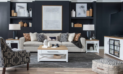 Tactile, yet refined, and always modern. Clean lines meld with comfortable textures and tones in our total home collection, Franklin. Simple farmhouse details such as block feet, beveled framed drawer fronts, planking and X motifs create visual interest in a modern way and without feeling too cluttered. Harvest Oak tops on quartered white oak veneer sit atop Natural White painted bases. Select items offered in Aged Black that repeats the finish on hardware and accents.