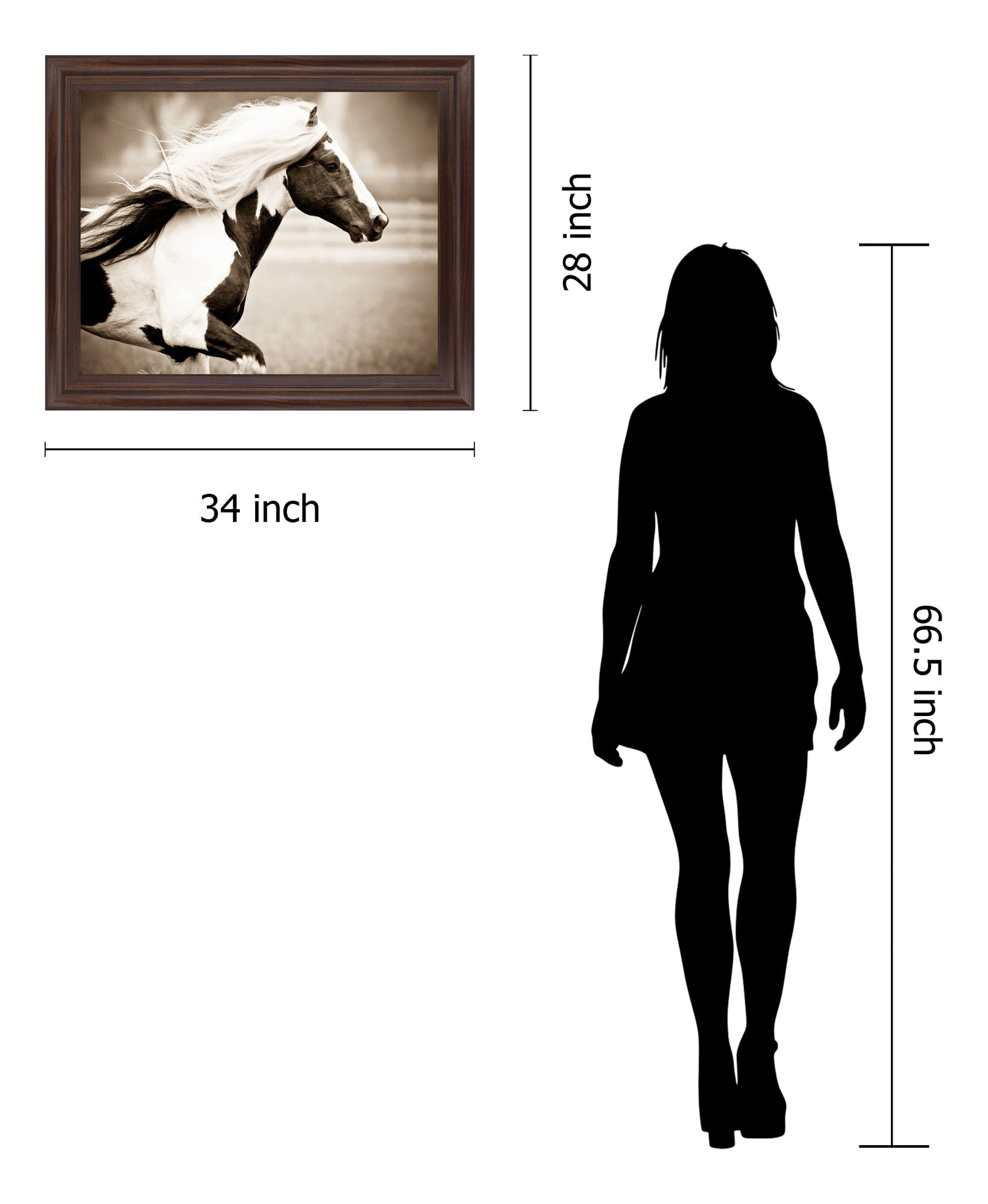 Experience the dynamic beauty of a horse in full stride with this captivating framed photograph. The flowing mane and striking black-and-white coat are rendered in a warm sepia tone, evoking a timeless sense of grace and freedom. Set within a rich cinnamon mocha frame, this piece effortlessly blends rustic charm with contemporary elegance, making it a perfect centerpiece for living rooms, offices, or dens. Expertly crafted with real glass and ready to hang, it celebrates the raw power and serene spirit of animals in motion, inviting you to bring a touch of nature's vitality into your space.
