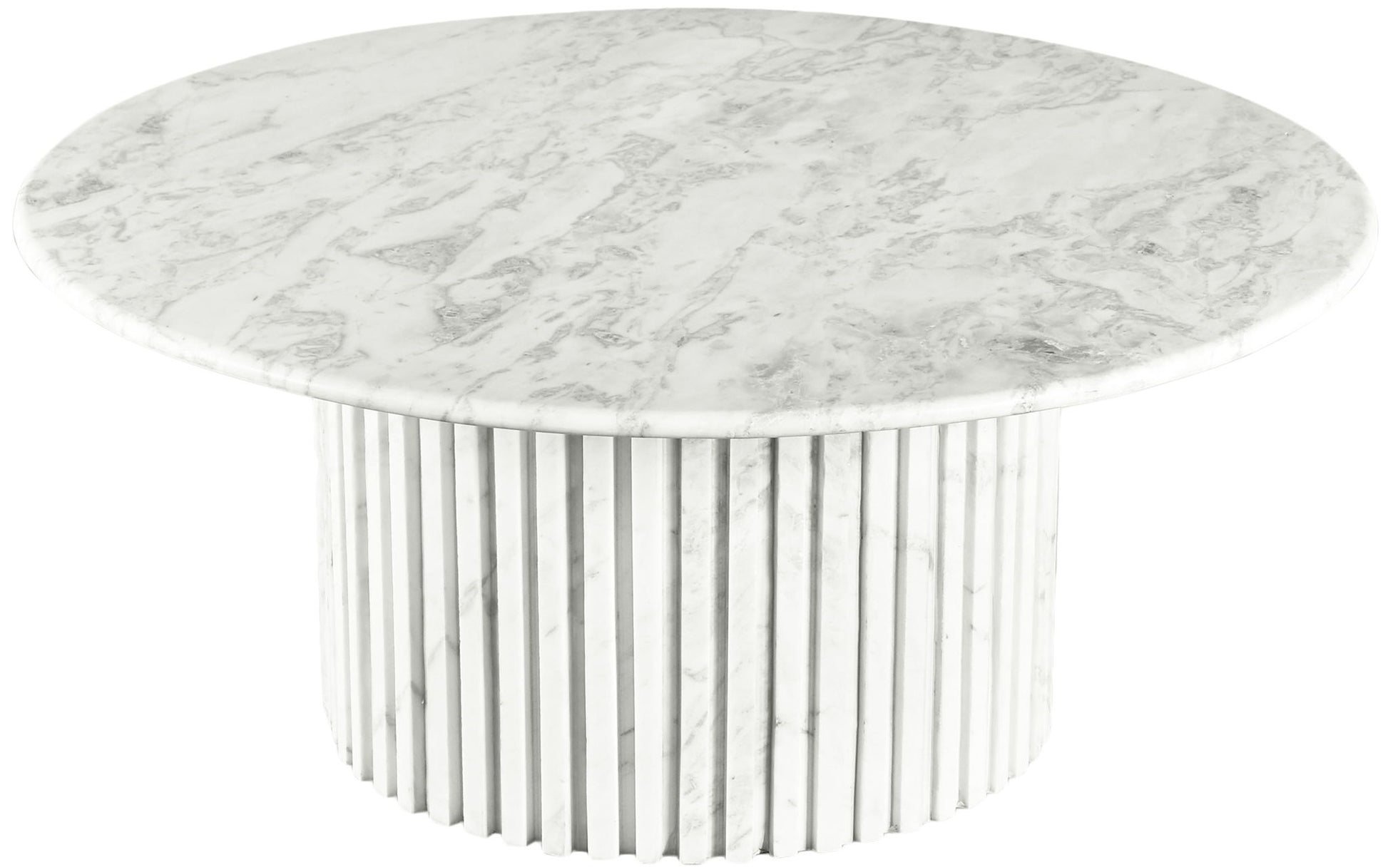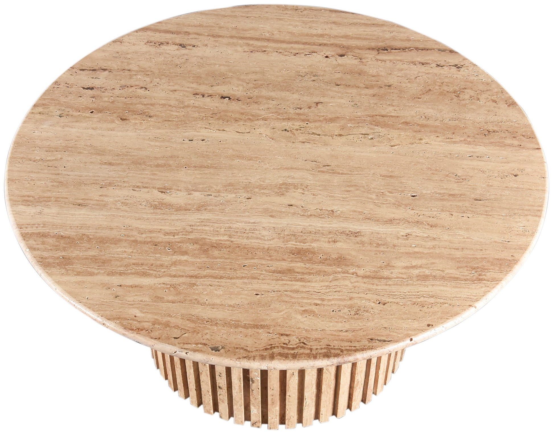 Add a refined look to your room with this handcrafted Genoa coffee table, a stunning masterpiece that marries elegance and practicality. Crafted from genuine travertine, each table is a unique work of art, featuring a travertine top with intricate white veining. The fluted travertine base adds a touch of art deco design, making it a statement piece in any room and adding to its heirloom-quality design.