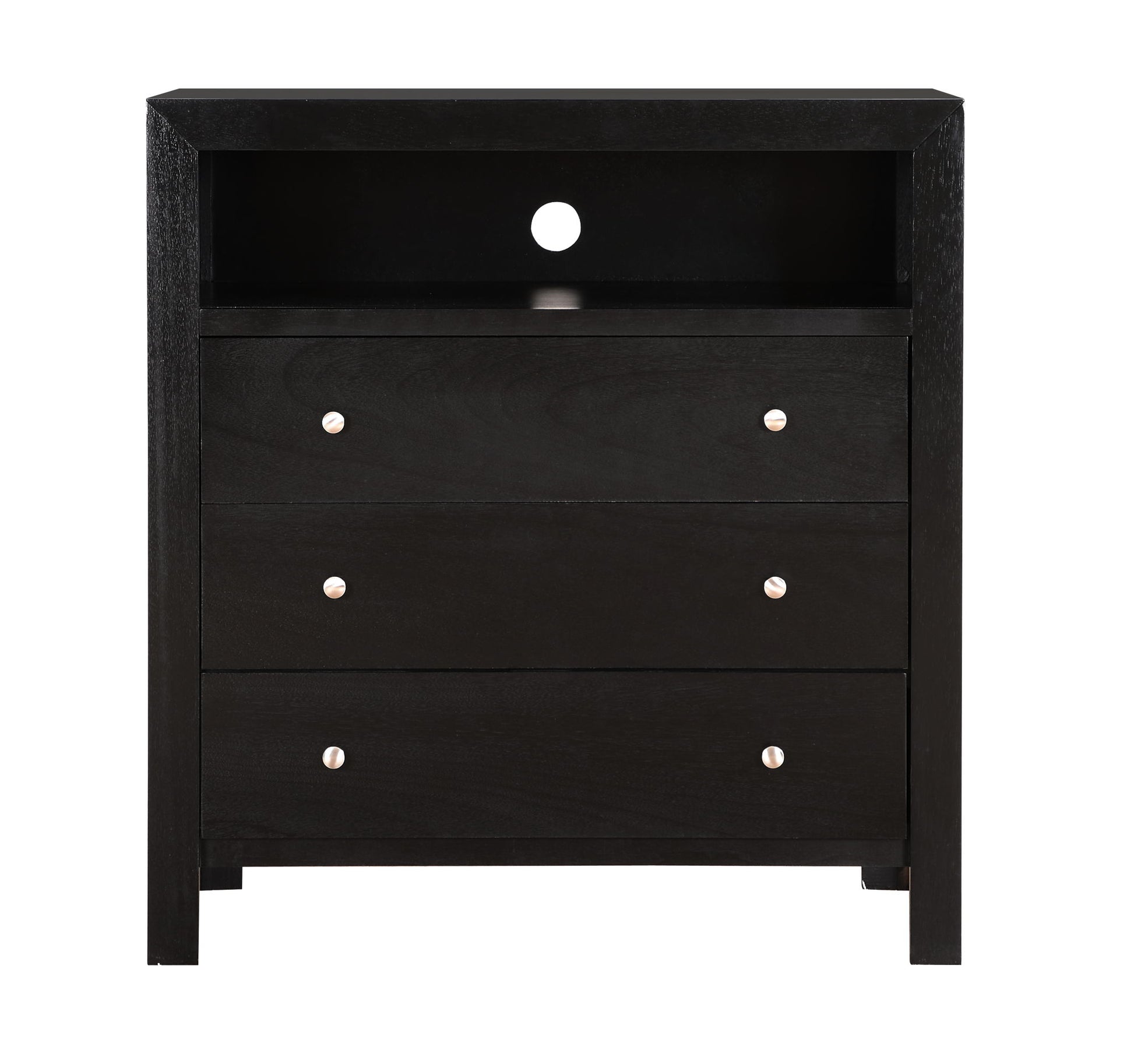 This media chest combines functionality with eye-catching design, making it an excellent addition to any room. Sporting a sleek color, it features three ample drawers that are designed to store your media accessories and essentials easily, ensuring that everything you need is neatly organized and readily available. Constructed with durable wood veneers, the chest not only provides visual appeal but also stands the test of daily use with ease. With overall dimensions of 36"H x 34"W x 17"D, it occupies minimal space while maximizing storage potential, fitting well within various interior layouts. The dove-tailed drawers enhance both functionality and style, while the contemporary nickel hardware adds a modern touch. This multi-functional piece not only serves as a media chest but also enhances the aesthetics of your living space, making it a versatile item suited to any home decor.