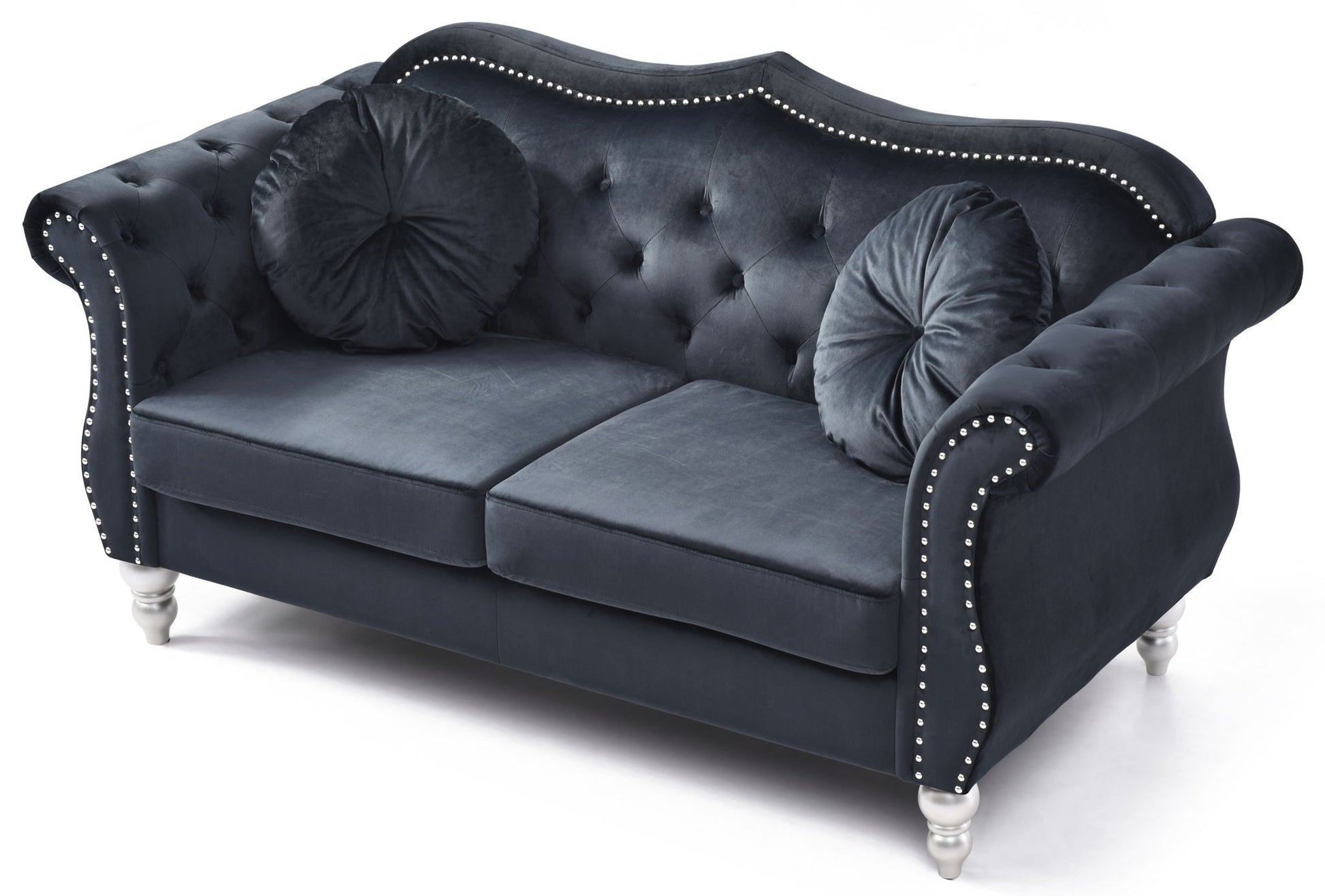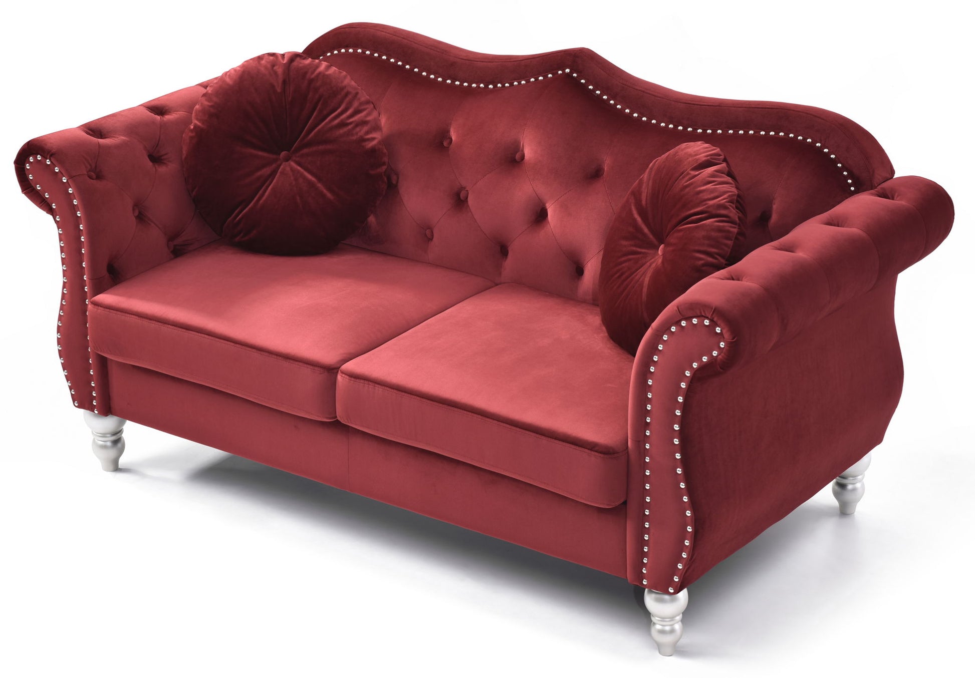This loveseat brings together comfort and style, making it an inviting addition to your home decor. With its soft velvet cover, it promotes a cozy atmosphere, and it includes two throw pillows for added comfort. Measuring 34"H x 68"W x 35"D, this loveseat can suit a range of living spaces, from apartments to larger homes. The tufted back and arms enhance the seating experience, ensuring a comfortable spot for unwinding after a long day. Constructed with a sturdy hardwood frame, along with a pocket coil seat cushion, it is designed to withstand daily comfort needs without compromise. Additionally, the hand-applied nailheads feature adds a finer touch, while the robust wood legs ensure stability and complete the overall design aesthetic.