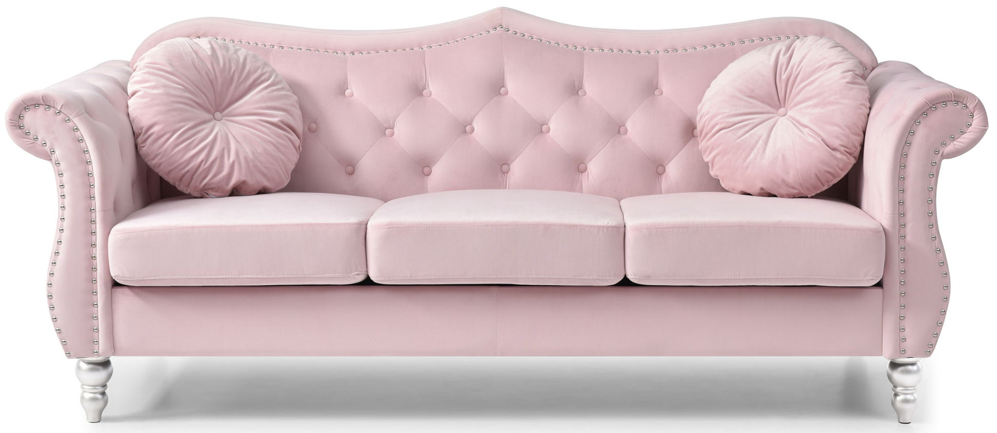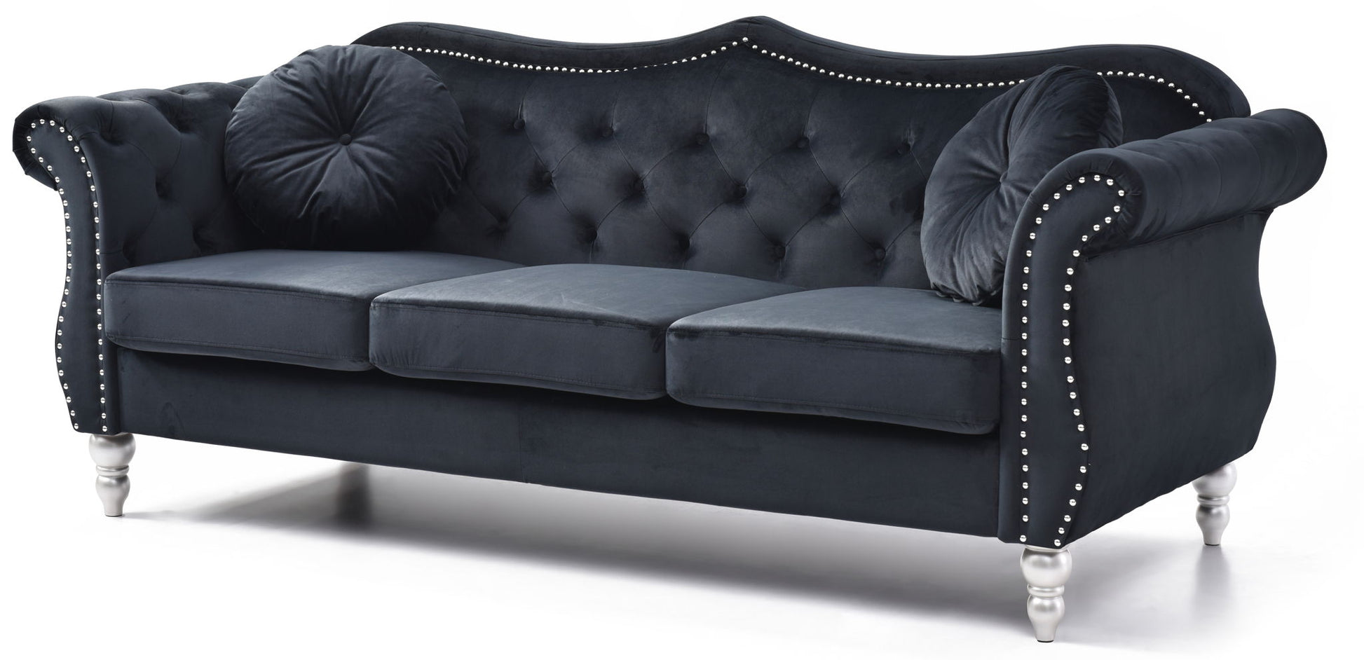 This modern sofa is designed to enhance your living space with unmatched comfort and distinctive style. The deep velvet upholstery presents a contemporary aesthetic that fits well in various decors, while the included throw pillows offer additional relaxation options. With dimensions of 34"H X 82"W X 35"D, it provides ample space for family and friends to enjoy gatherings. The tufted back and arms contribute a touch of sophistication while ensuring a cozy seating experience. Crafted with a strong hardwood frame, this piece delivers reliable support day after day. The carefully hand-applied nailheads accentuate the design, adding a touch of elegance without overwhelming the overall look. Moreover, the pocket coil seat cushions deliver enhanced comfort, allowing you to lounge for hours. The contemporary wood legs not only add to the appearance but also provide stability to the structure, making this sofa a wonderful choice for enhancing your home's ambiance.