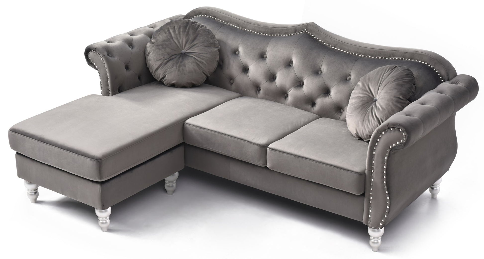 This sofa chaise unites comfort with contemporary design, making it a standout feature in your living space. Wrapped in soft velvet, it includes two matching throw pillows that enhance relaxation and offer extra support for your head and neck during leisure moments. With dimensions of 34"H x 81"W x 35"D, this chaise is adaptable to a variety of room sizes, from apartments to larger homes. The tufted inside back and arms not only enhance the overall aesthetic but also provide a cozy seating experience for you and your visitors. Constructed with a hardwood frame, this piece delivers dependable support over time, ensuring your investment is worthwhile. Additionally, the hand-applied nailhead trim adds a refined touch that complements its overall appeal. Experience exceptional comfort with pocket coil seat cushions designed for daily comfort, while the stylish wood legs add an element of stability and sophistication. This chaise not only accentuates your home decor but also invites relaxation in style.