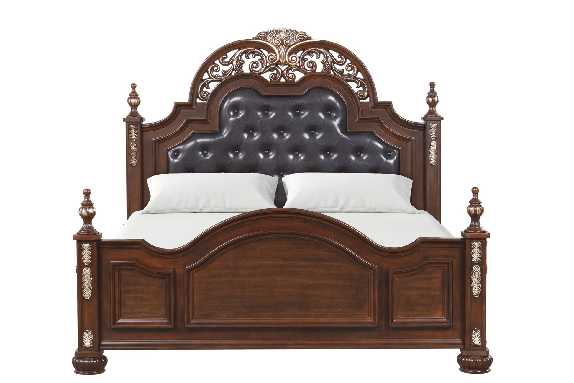 Introducing the Bed, a remarkable piece designed to elevate the aesthetic of your bedroom while maximizing comfort for a restful retreat. This striking bed features a rich finish that contributes warmth and charm to your sleeping space. Its construction not only prioritizes visual appeal but also enhances comfort levels, making it an excellent choice for any home. The headboard showcases deep button tufting, providing both style and cozy back support for those leisurely moments spent in bed. Additionally, the elegant hand-painted gold accents on the posts highlight exquisite craftsmanship and attention to detail, making this bed a standout centerpiece. This bed is designed to fit comfortably in larger rooms while offering ample sleeping space without compromising on style.
