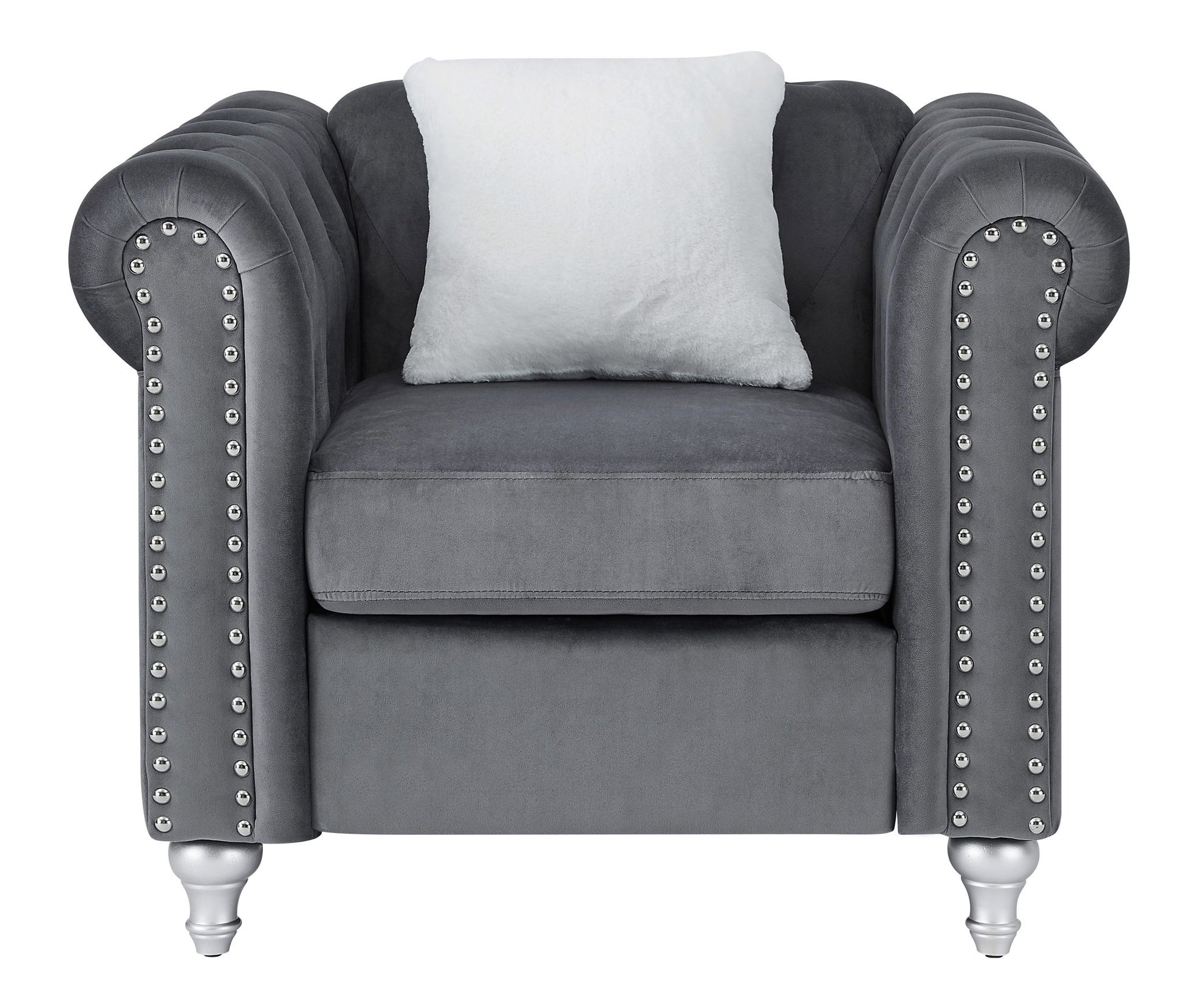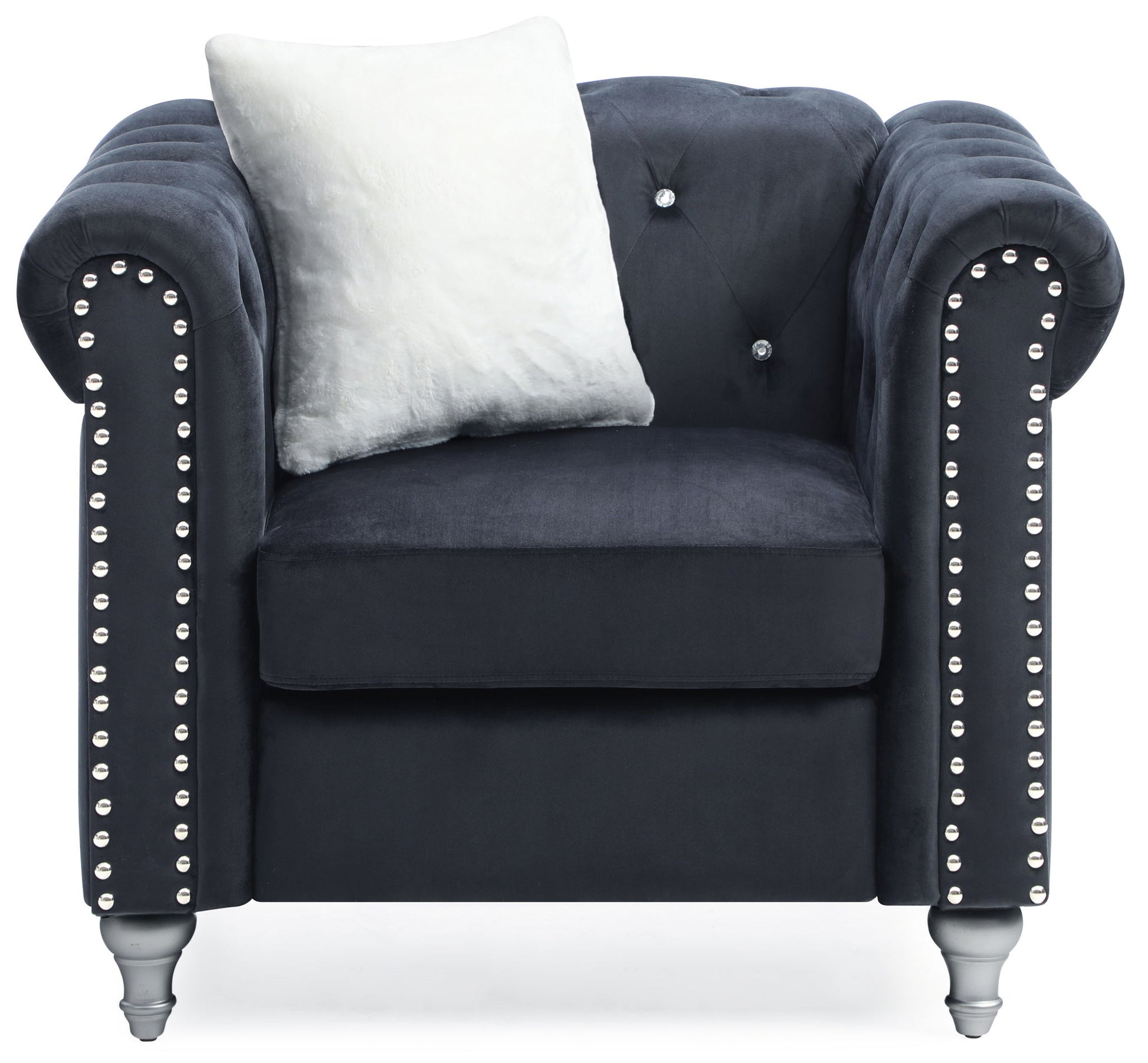 This chair serves as a cozy yet stylish enhancement to any living space, seamlessly completing various interior designs with its inviting character. It showcases a sophisticated shade, crafted from jeweled tufted micro suede velvet that offers a unique tactile experience. The beautifully painted wood legs not only ensure stability but also harmonize with the plush pocket coil cushions, which are designed for maximum relaxation and comfort. With dimensions of 30"H x 38"W x 34"D, this chair fits easily into both compact and spacious environments, making it an adaptable choice for your home. The chrome nailheads outline the structure, adding an elegant touch and enhancing its overall look. To elevate its charm, it comes with a contrasting throw pillow, making it easy to combine with other decor elements. This chair is thoughtfully designed to provide both comfort and style, ensuring it becomes a delightful focal point in your home.