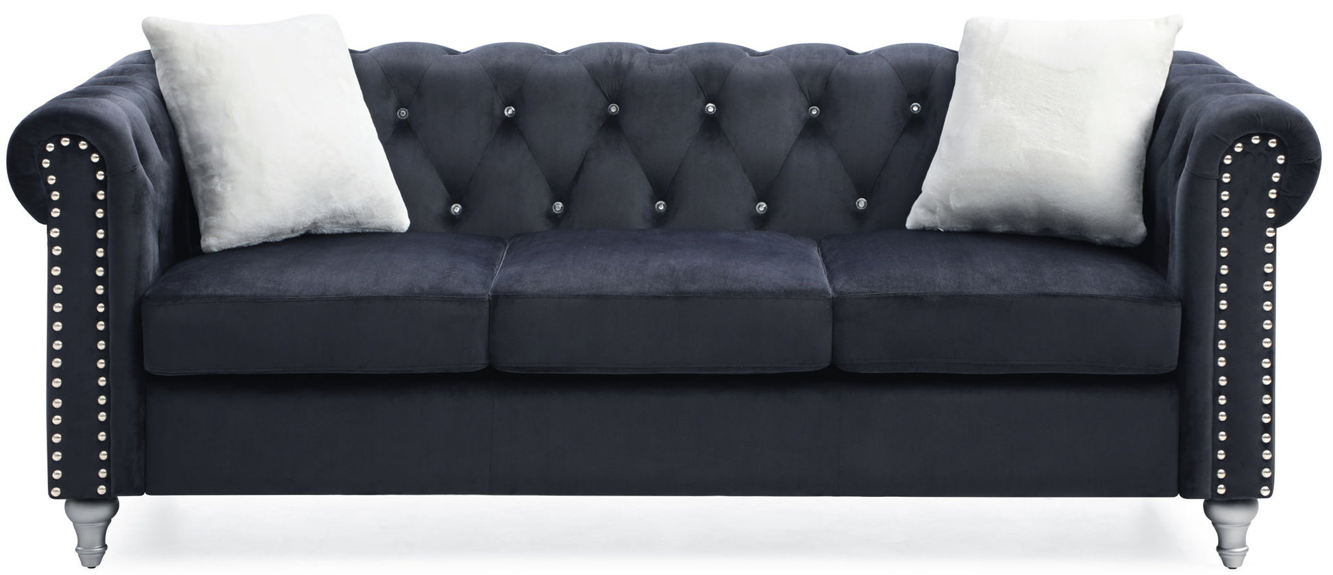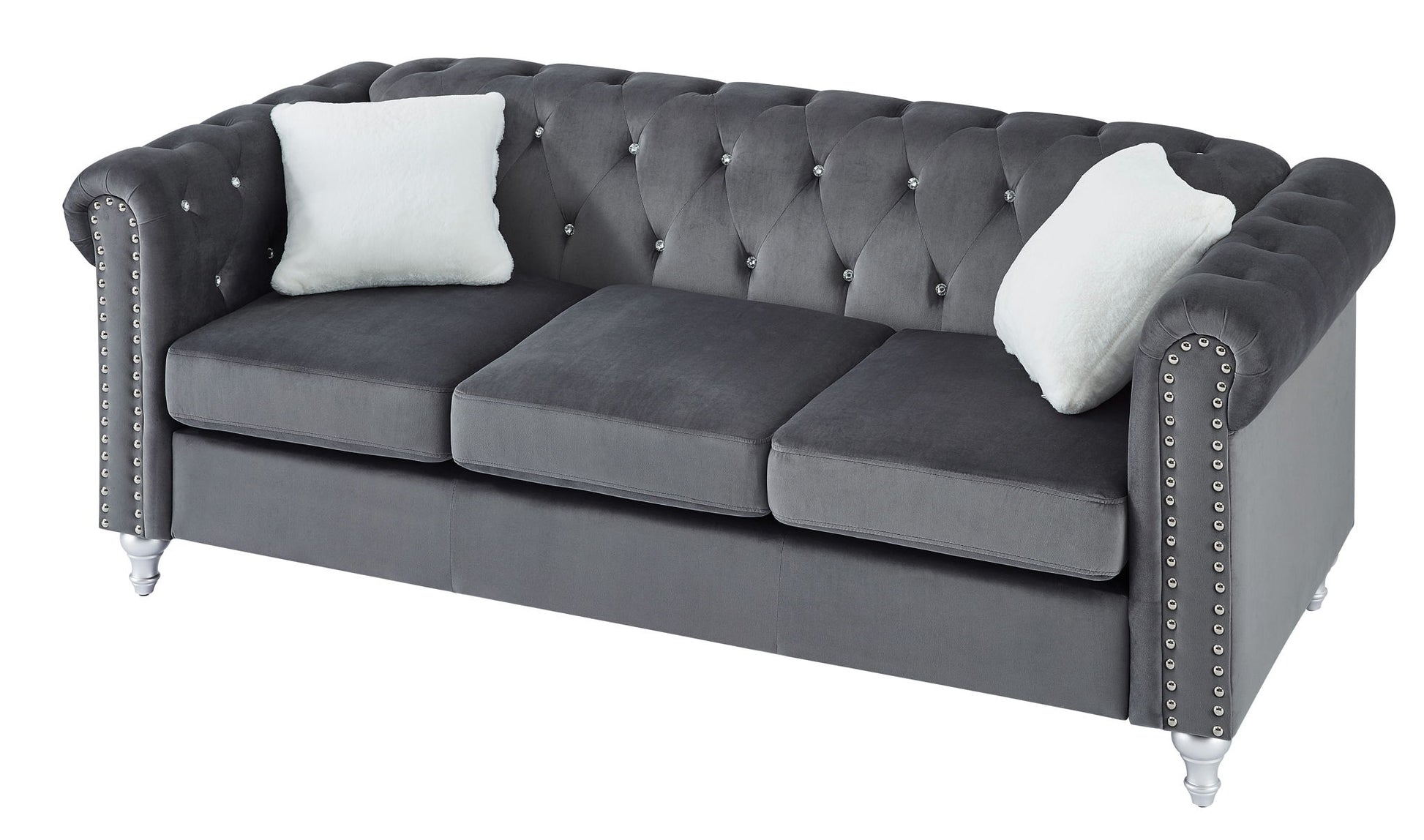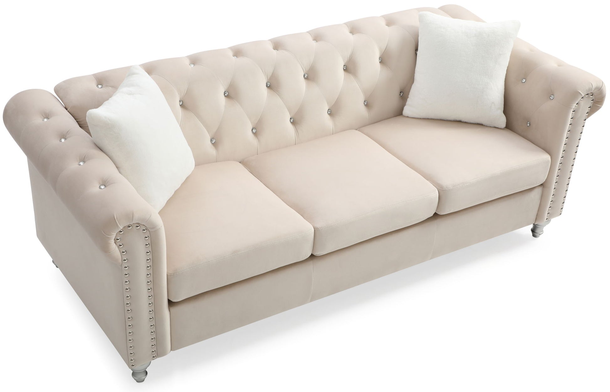 This inviting sofa embodies a harmonious blend of refined design and function, perfectly enhancing various living spaces. The soothing tone seamlessly complements an array of decor styles, while the jeweled tufted micro suede velvet cover introduces a rich, tactile texture that encourages relaxation and comfort. It stands as a focal point in any room, inviting gatherings and conversation. With dimensions of 30"H x 83"W x 34"D, this piece provides ample seating for family and friends, making it an ideal choice for entertaining without occupying too much floor space. Crafted for durability, the sofa promises to deliver comfort and aesthetic appeal for years to come. The painted wood legs not only contribute to a contemporary look but also provide robust support for the entire structure. This versatile sofa balances practicality and visual charm, culminating in a perfect addition to enhance your living experience in any setting, ensuring you enjoy both style and comfort at home.