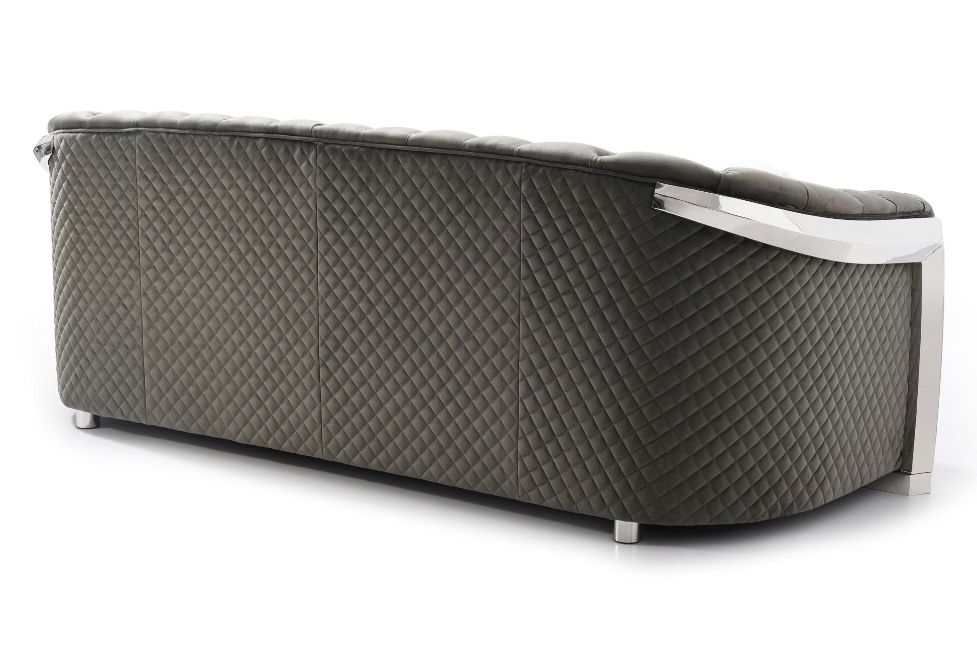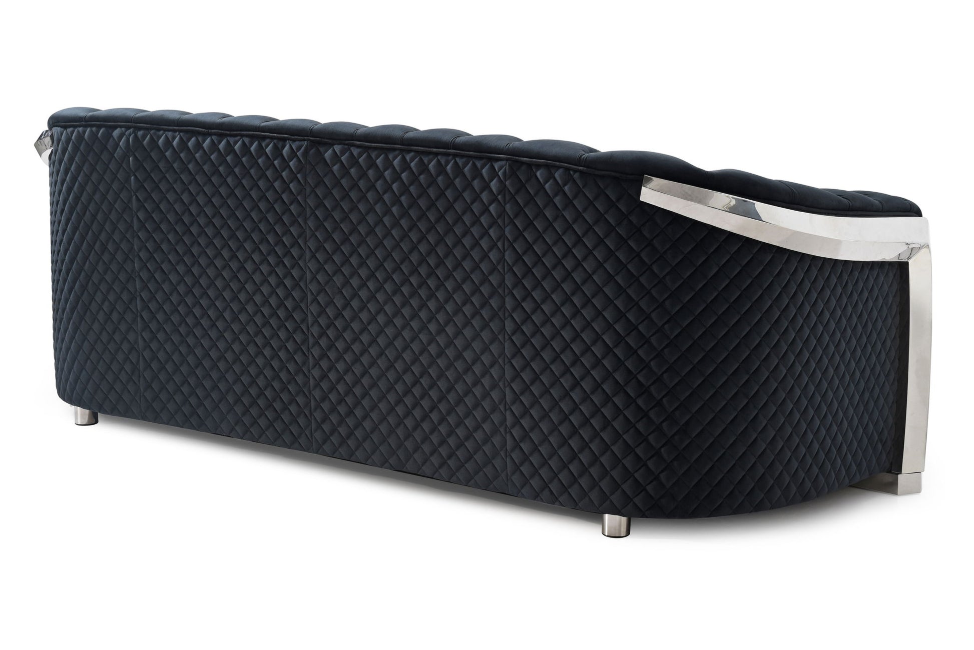 The Sapphire Sofa showcases a modern aesthetic that enhances your living space with its chic design and functional features. Wrapped in luxurious velvet, this sofa provides a blend of comfort and style, making it an inviting spot for relaxation and socializing. The soft fabric invites you to unwind, while the durable build promises long-term enjoyment. The striking chrome trim not only accentuates the sofa's clean lines but also contributes to its resilience and visual allure. With dimensions measuring 34 inches in height, 94 inches in width, and 37 inches in depth, the sofa accommodates gatherings with ease, making it ideal for entertaining friends and family. The refined diamond quilted pattern on the back and sides enriches the design, creating a sophisticated ambiance. Additionally, the contrasting faux fur throw pillows enhance comfort and style, ensuring this sofa becomes a cherished addition to your home.