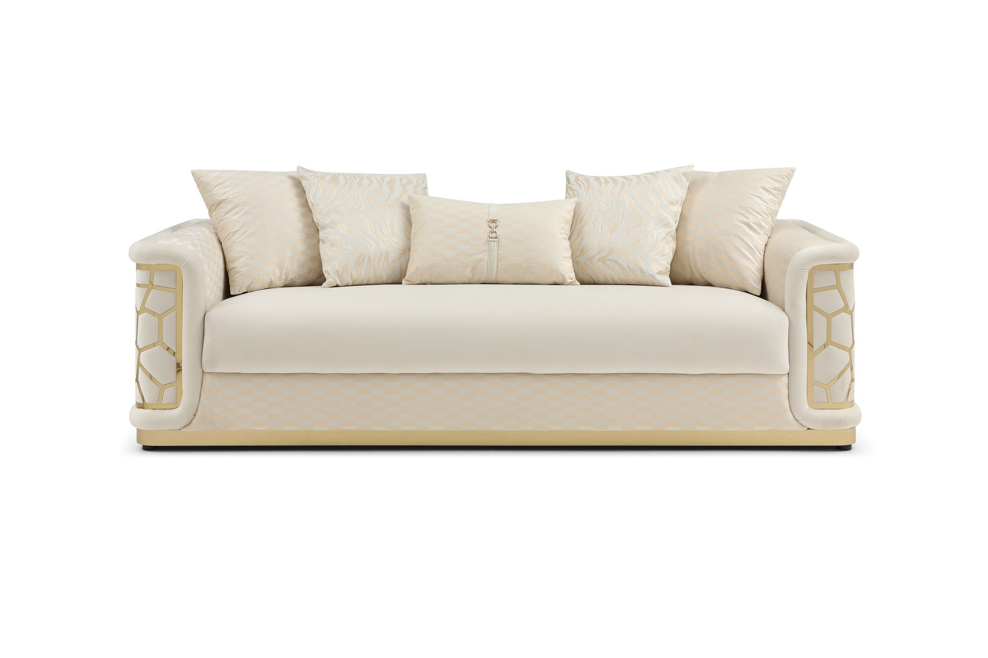 This beautifully crafted sofa combines modern Art Deco aesthetics with practical comfort, making it an ideal addition to your home. The striking color enhances the visual appeal and complements various interior styles effortlessly. Not only does the soft micro suede cover provide durability, but it also makes maintenance a breeze, ensuring your sofa remains looking fresh for years to come. Measuring 26"H X 92"W X 36"D, this spacious sofa allows ample room for relaxation, whether you're hosting family gatherings or enjoying a quiet evening. Gloss brass trim accents the sides and base, contributing to a sophisticated style that elevates any living space. With its unique patterned fabric on inside arms and back cushions, this sofa stands out as both functional and fashionable, offering a delightful contrast to its smooth exterior. Designed for long-lasting use with a kiln-dried hardwood frame, this piece is built to withstand everyday wear and tear, ensuring you can enjoy it for years to come.