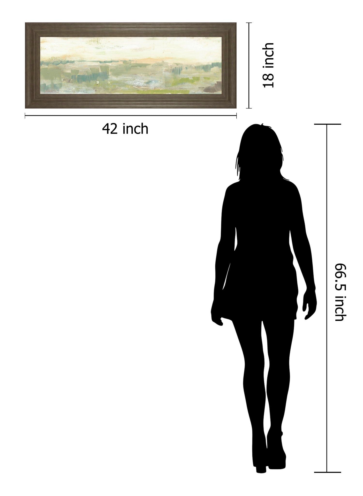 Step into a tranquil world with this serene horizon artwork, where soft greens and muted earth tones blend seamlessly to evoke a peaceful botanical landscape. The elegant 3-inch tranquil ash frame adds a sophisticated touch, enhancing the calming palette and subtle textures of the graphic art print. Crafted with premium real glass for crystal-clear clarity, this framed piece brings a refined natural beauty to any living room, bedroom, or office. Ready to hang and proudly made in the USA, it invites you to embrace nature's quiet elegance and timeless charm in your space.