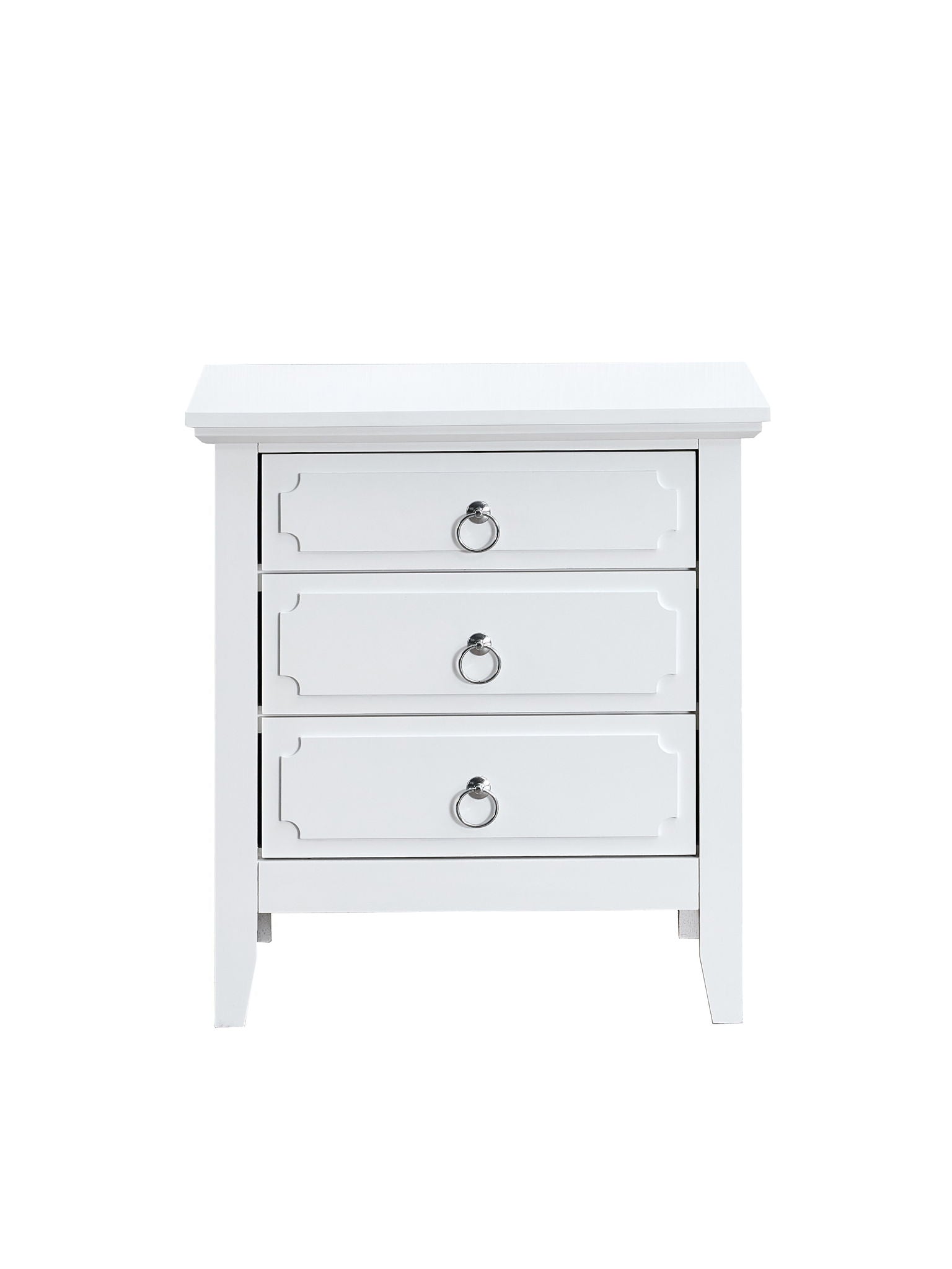 Crafted from a blend of solid and manufactured wood, this fully assembled 3-drawer nightstand offers both durability and convenience. Featuring polished nickel hardware and removable handles, it allows for easy customization to suit your style. Each drawer is equipped with center-mounted guides and safety stops for smooth, secure operation. With its clean design and practical storage, this nightstand is a versatile addition to any bedroom.