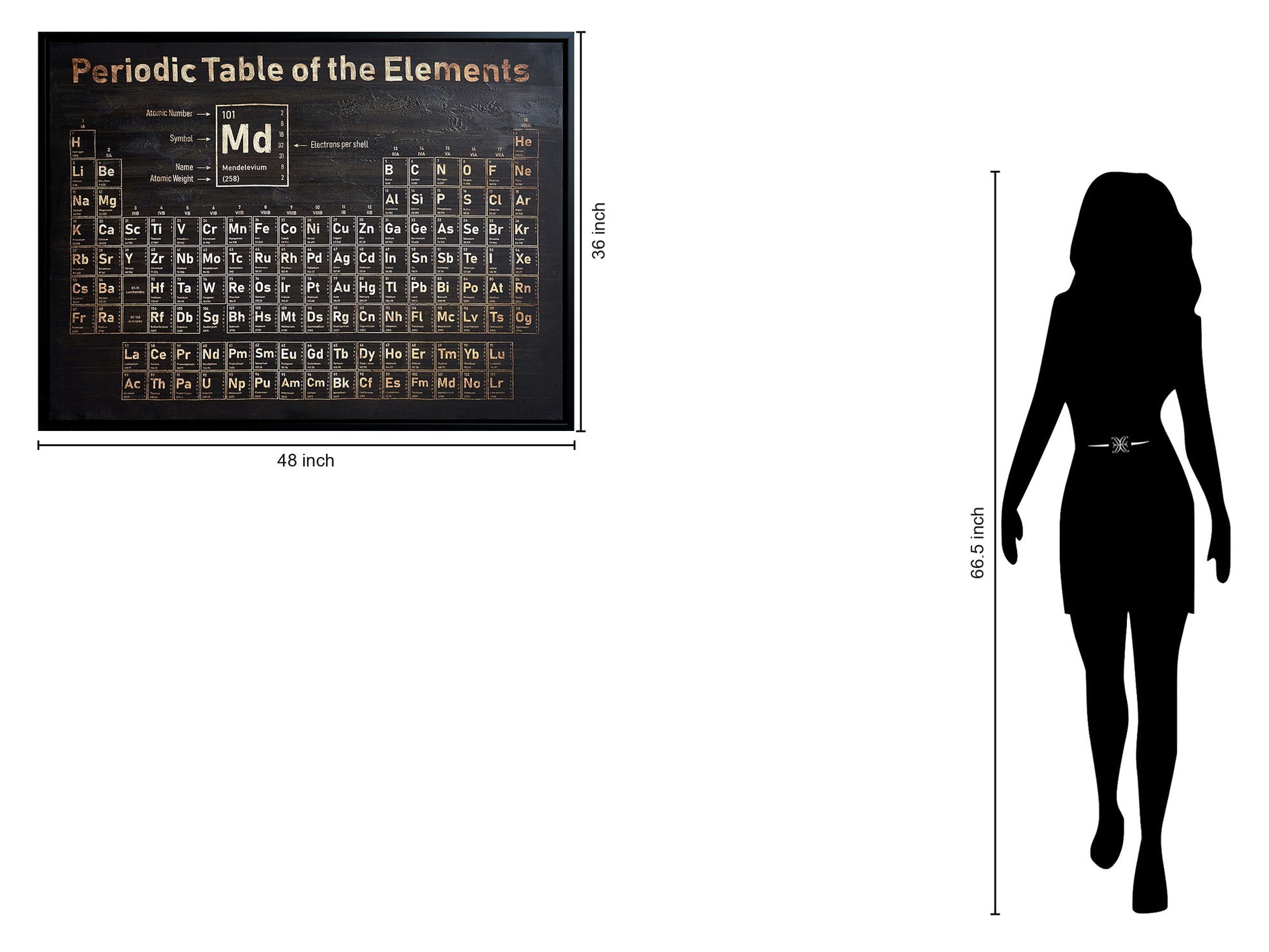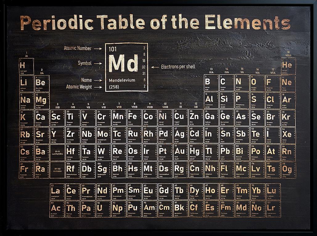 Discover the timeless elegance of the "Vintage Luxe Periodic Table," a hand-painted wrapped canvas that brings a sophisticated scientific charm to any space. This contemporary graphic art piece features a detailed periodic table rendered in warm metallic tones against a rich black background, creating a striking contrast that captivates the eye. Perfectly sized at 36 by 48 inches, it arrives ready to hang with professional mounting hardware, making installation effortless. Ideal for offices, classrooms, studies, or living rooms, this piece not only enhances your décor but also supports a meaningful cause, donating a meal to a hungry American child with each purchase. Elevate your environment with this blend of art, education, and social impact.