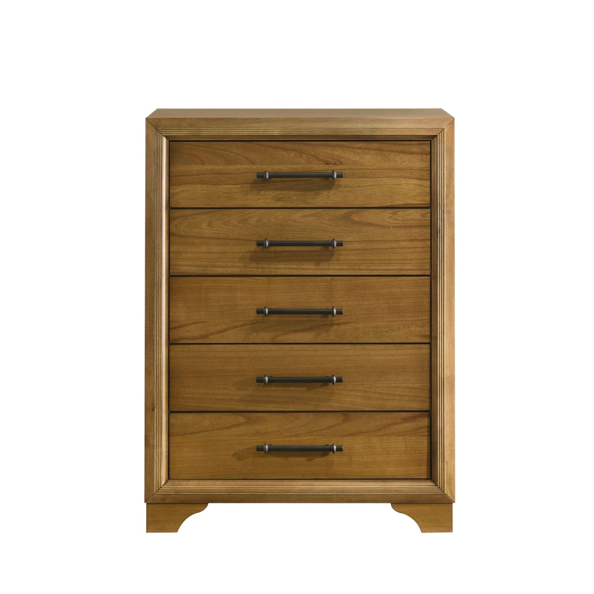 The Harmony 5-Drawer Chest epitomizes the charm of transitional style. The neutral, warm, and versatile tone of the piece’s solid and engineered wood framing creates an inviting essence and simplifies pairing with other pieces. Skillfully English dovetailed drawers and protective felt lining in the top drawer mark quality, thoughtful craftsmanship, furthering this piece’s appeal. Sleek metal handles adorn each drawer front, while elegantly beveled feet provide a sturdy foundation. For a practical and refined addition to your bedroom, the Harmony 5-Drawer Chest in Walnut delivers.
