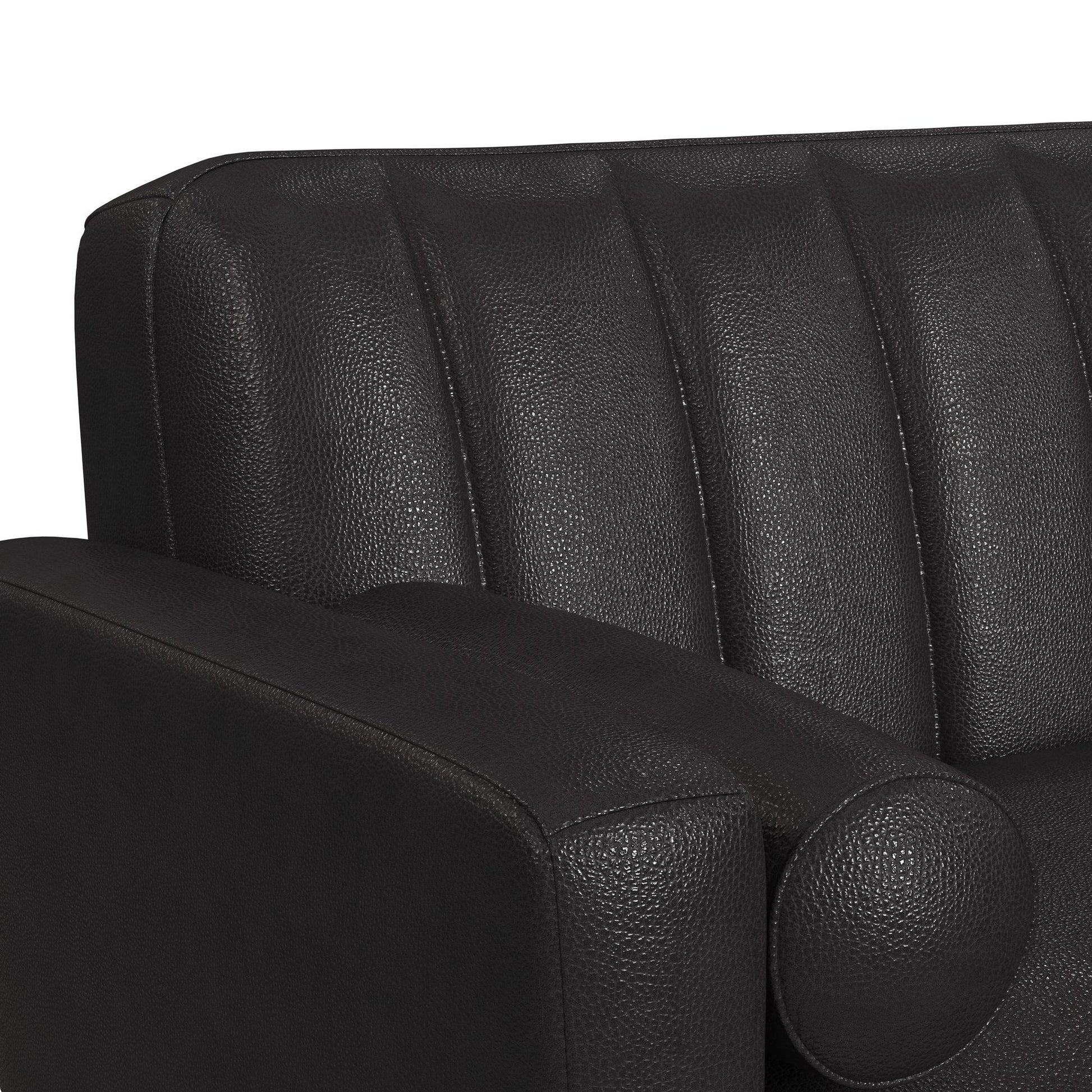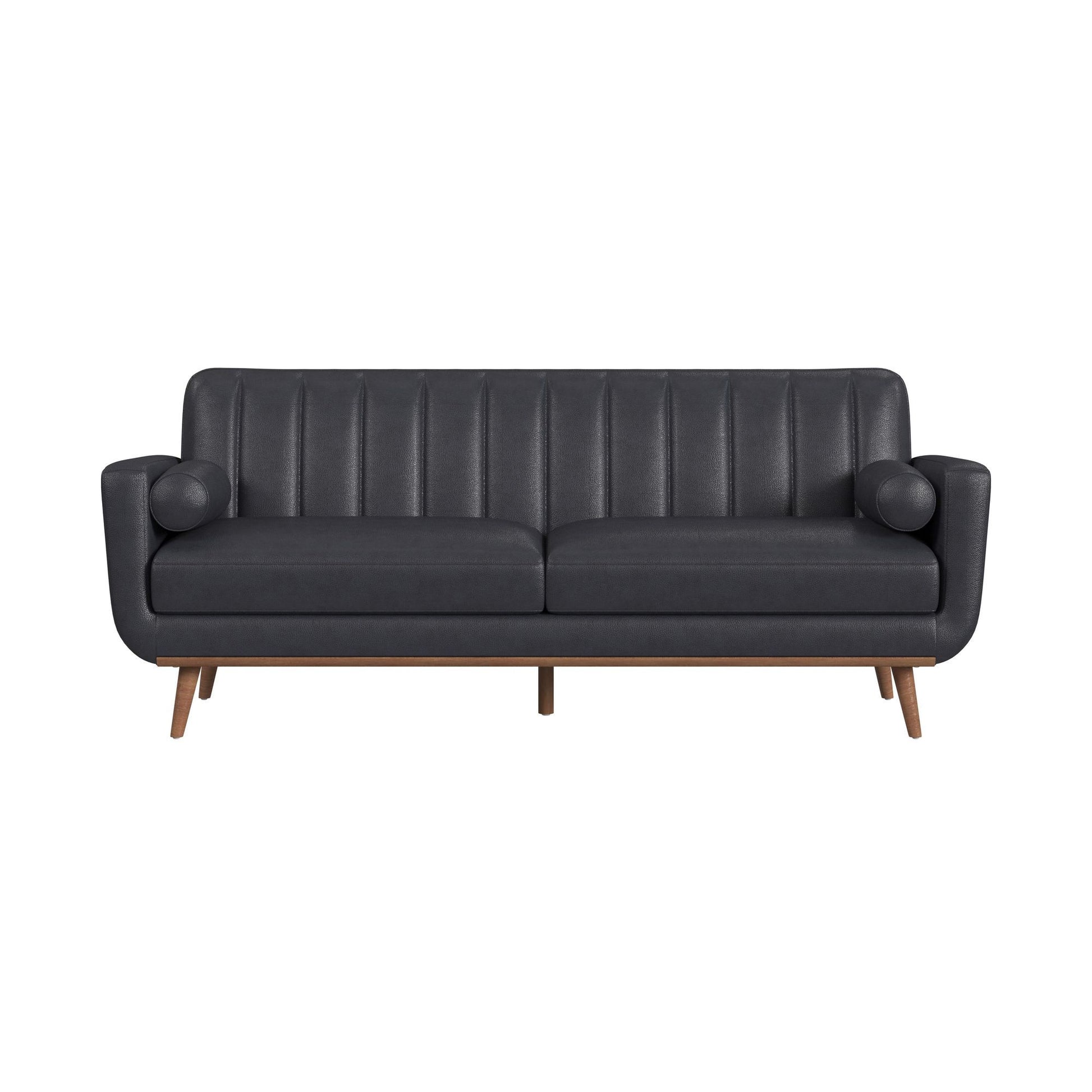 The Horizon Sofa with Wood Front and 2 Six Inch Bolster Pillows exudes the coveted charm of mid-century modern style. Built with a frame fully upholstered in quality faux leather, this piece is built for durability. Comfortable foam cushioning, decorative tufting on the backrest, and track arms forming sleek and modern lines culminate to mark thoughtful design, while an exposed front rail and wood legs highlight excellent craftsmanship. For a refined and sleek addition to your living space, the Horizon Sofa with Wood Front delivers in quality and style.