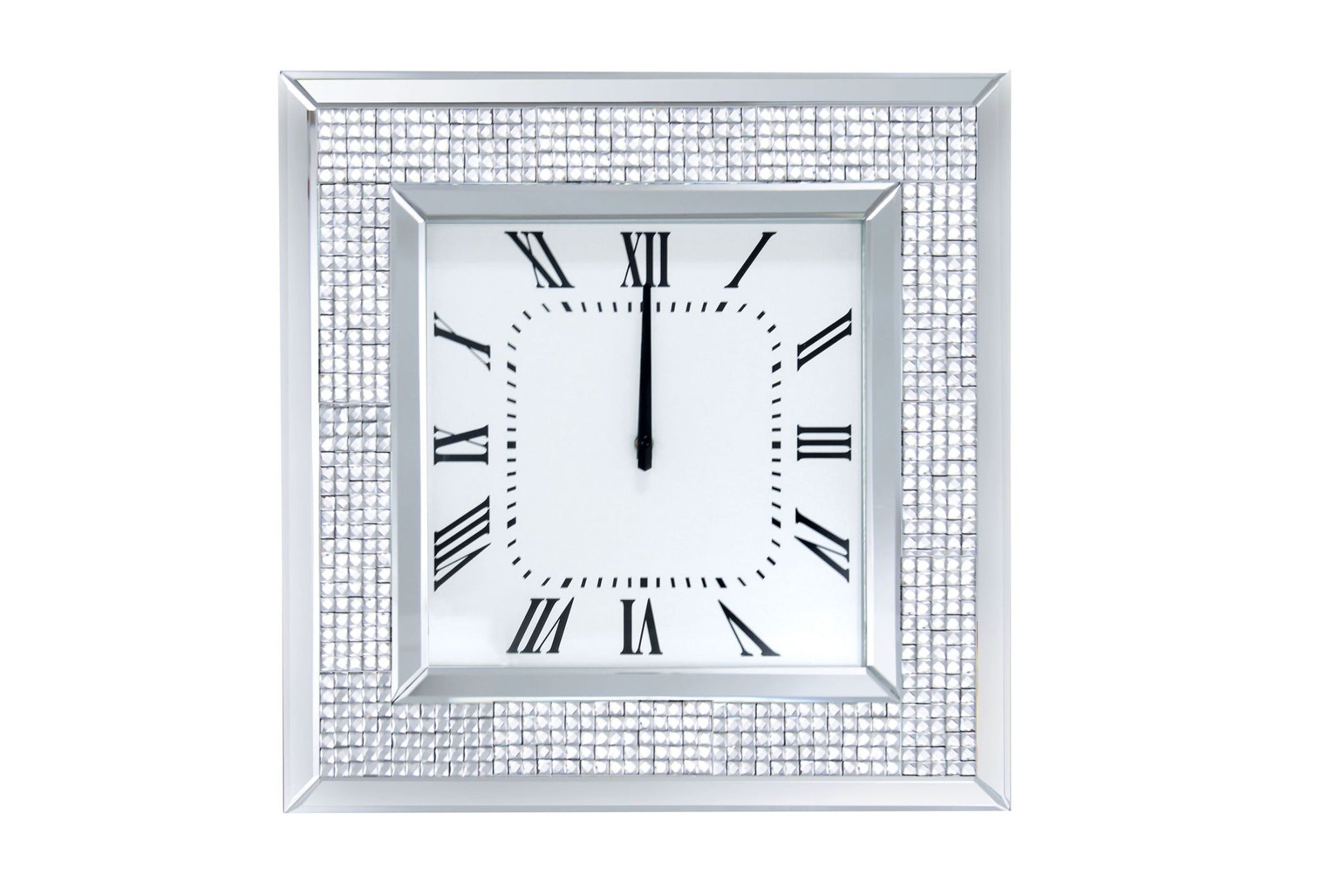 The Iama floating crystal wall clock, is sure to be focal point of any room. This stylish wall clock features a square mirror frame inlaid floating crystals around the face. The clock face has a clean, modern look featuring roman numerals.