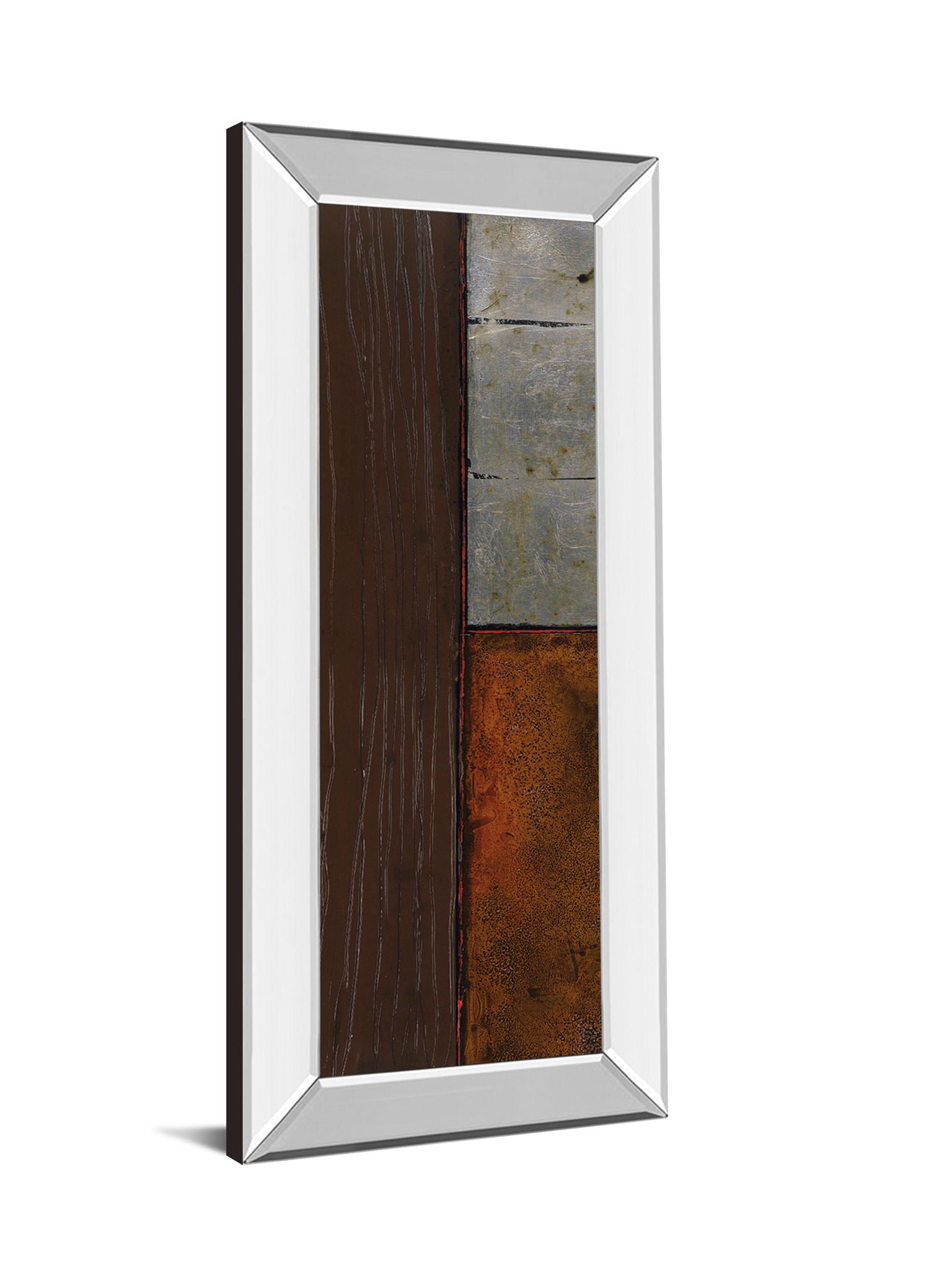 This captivating piece invites you into a world where textures and colors tell a story of natural beauty and modern sophistication. Rich earth tones of brown, rust, and gray blend seamlessly with abstract forms, creating a dynamic visual experience that adds warmth and depth to any room. Encased in a sleek mirrored frame, the artwork is protected by premium real glass, enhancing its vibrant details and reflective qualities. Perfect for living rooms, offices, or hallways, this vertical mixed media art piece is thoughtfully crafted to elevate your space with timeless elegance and contemporary charm.